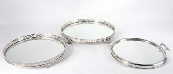 Três bandejas/ salvas de metal prateado, sendo duas com "gradinhas" e fundos com espelhos soltos; e, uma com alças e ...