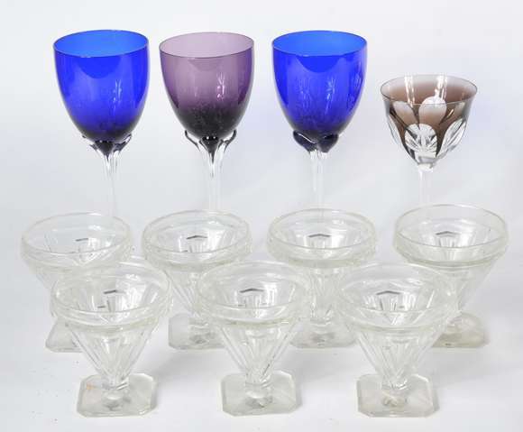 Diversos copos, sendo: 7 copos de vidro anos 50; 3 taças altas para vinho nas cores azul e lilás; e, uma taça para vi...
