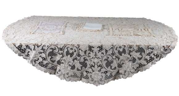 Toalha de mesa de renda bege feitio redondo, com três peças para jogo americano, caminho de mesa e 11 guardanapos.