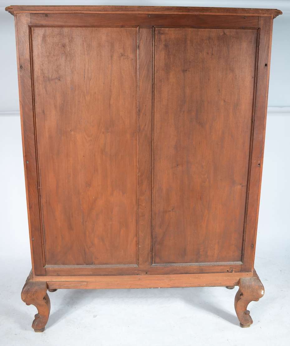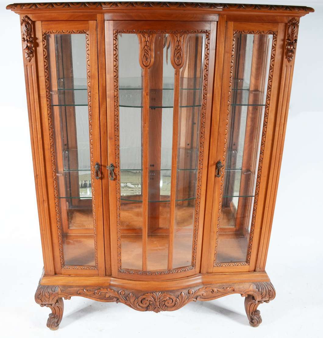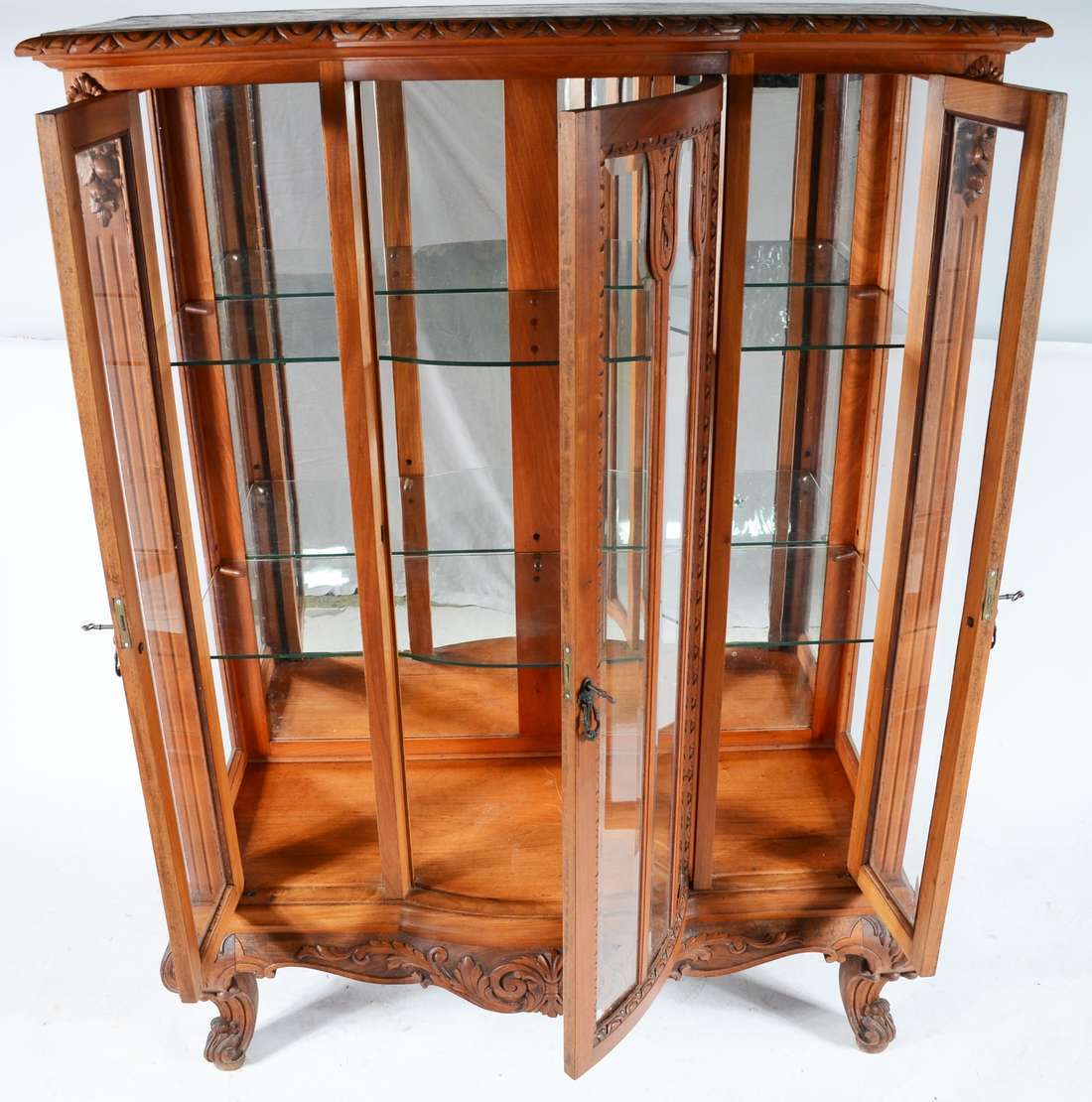 Vitrine de canto de madeira nobre, detalhes em marqueterie, fundo espelhado com prateleiras internas de vidro, pernas...