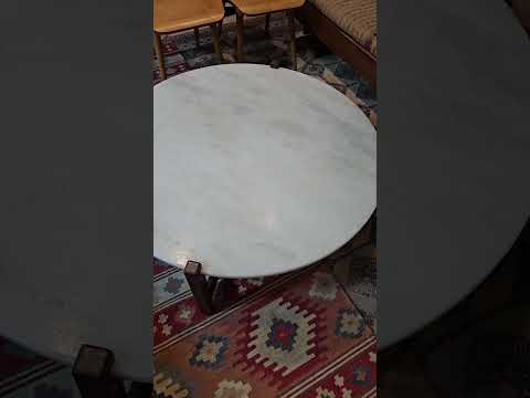 Mesa de centro de cerejeira com detalhes entalhados e tampo de mármore.
