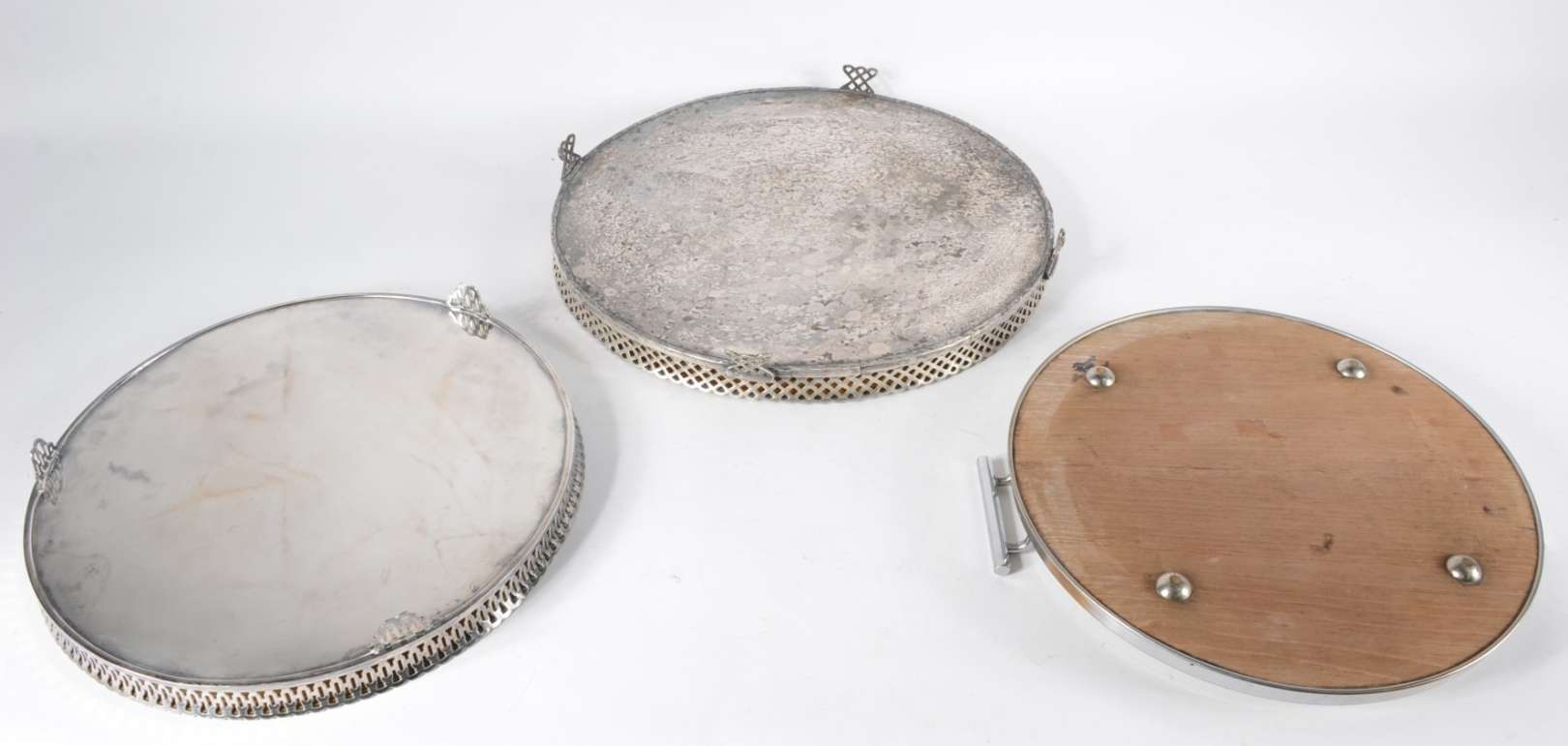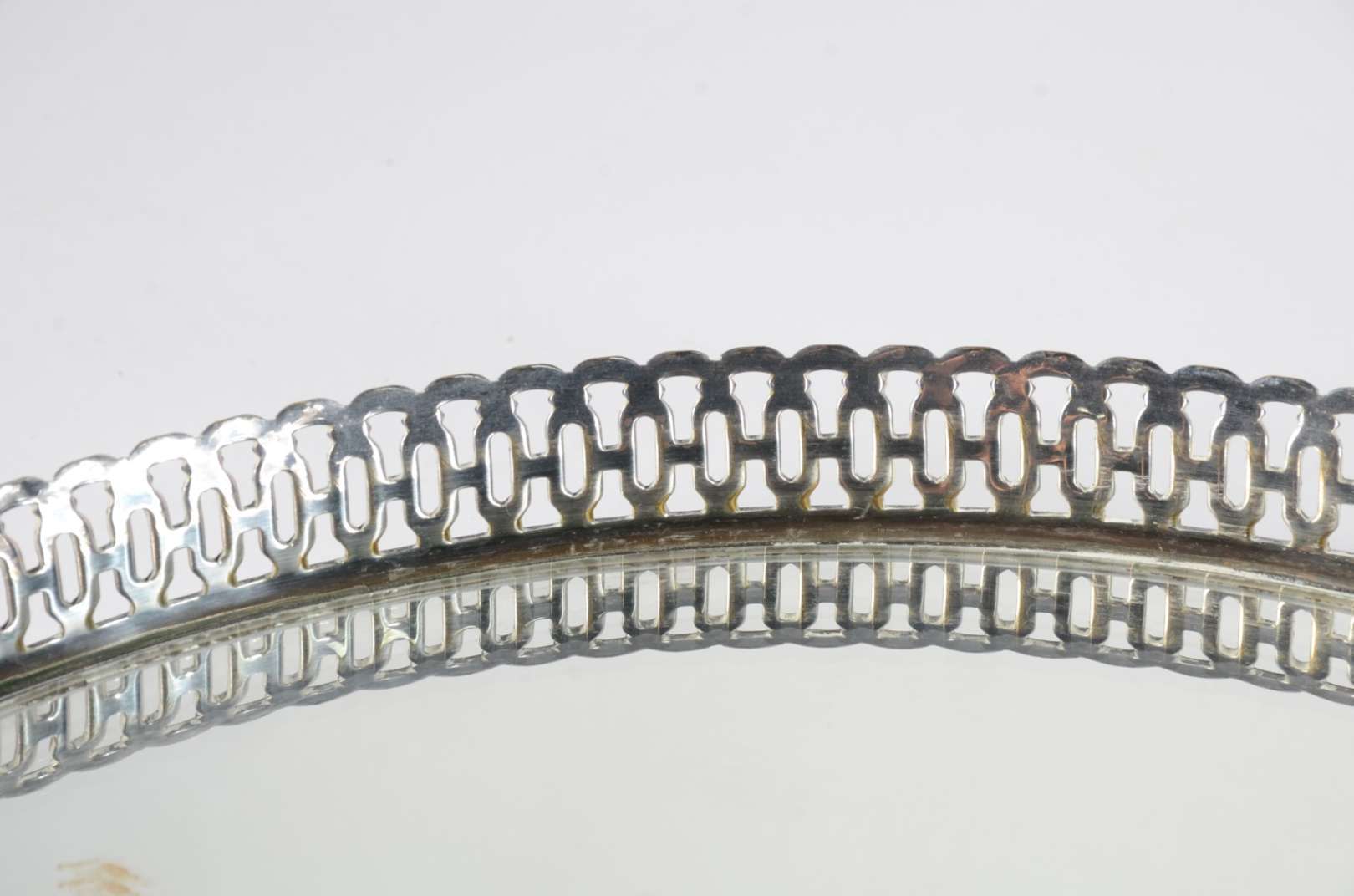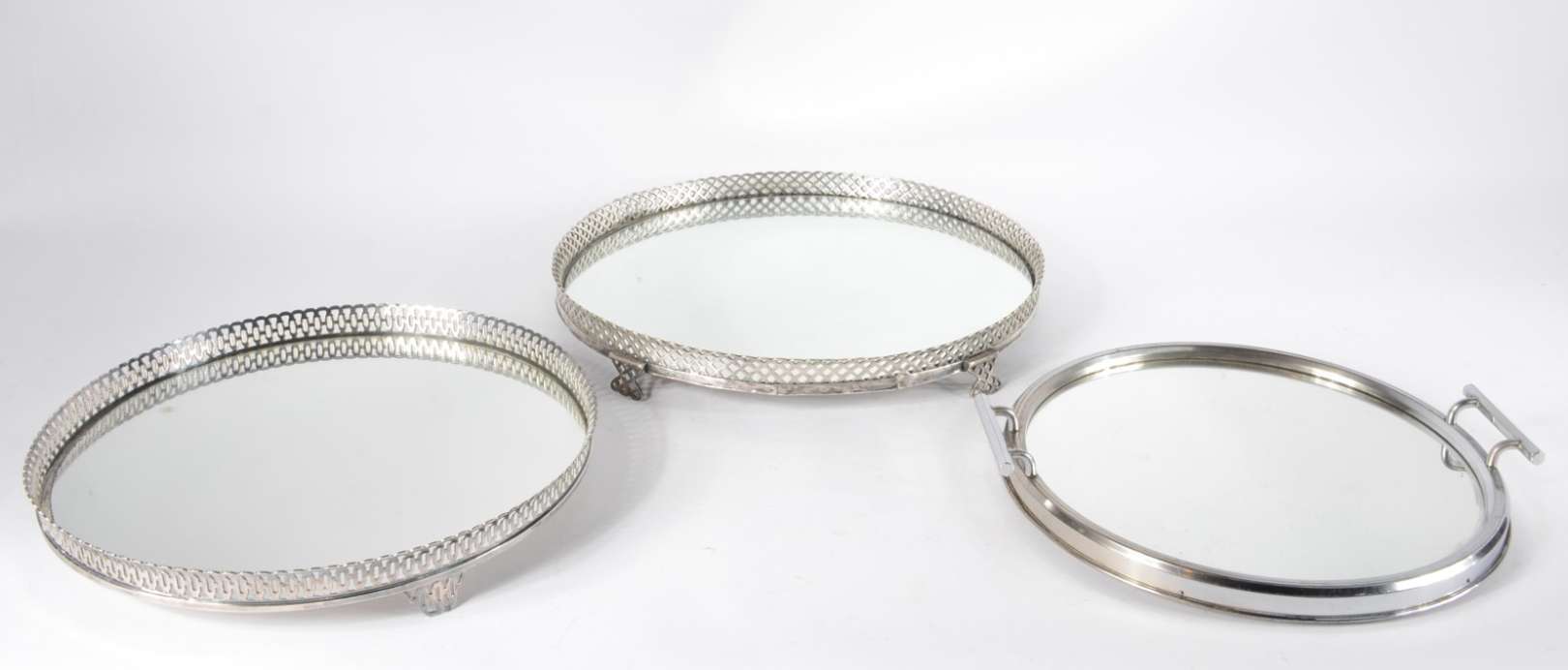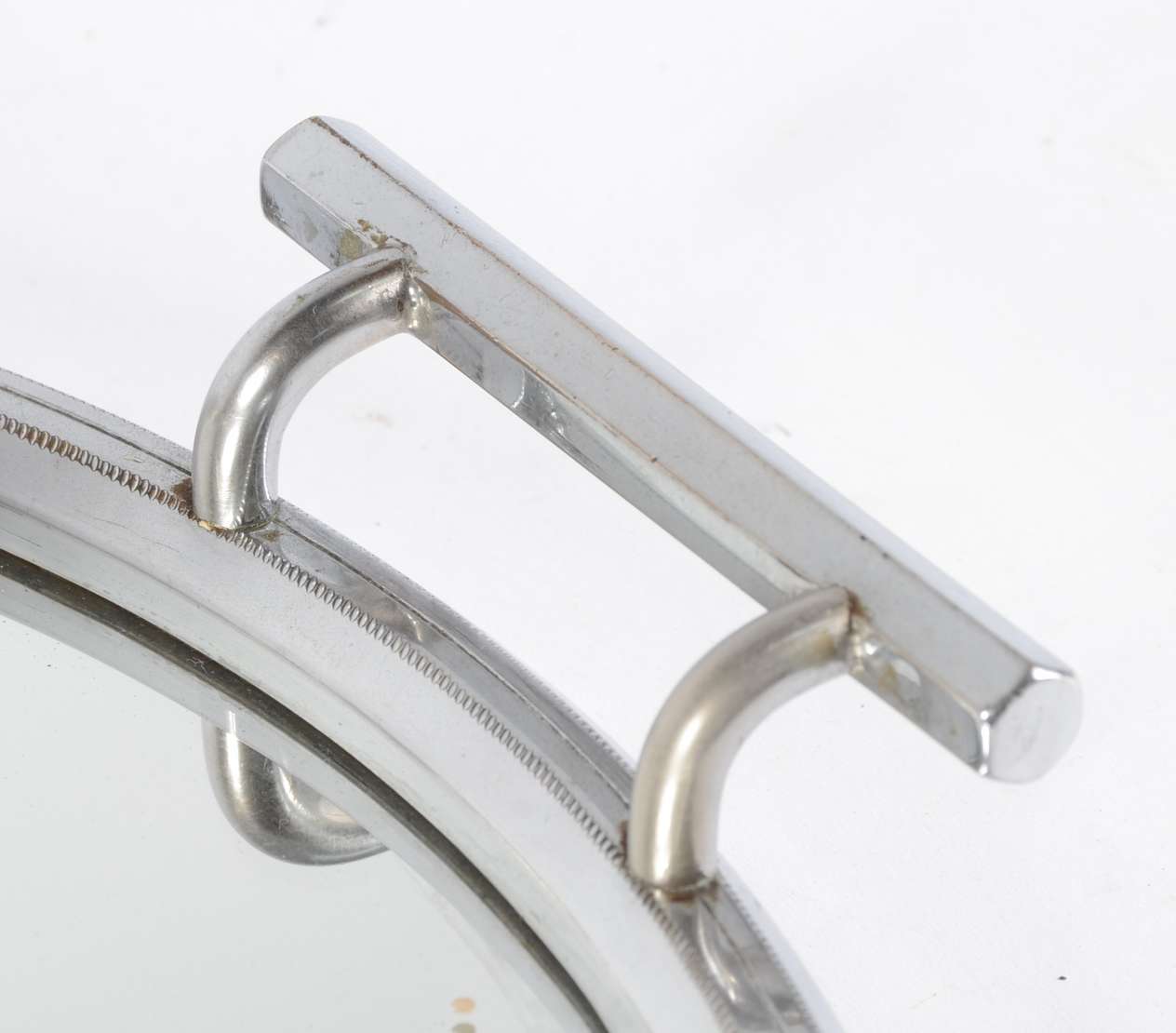 Duas peças, sendo: bandeja de vidro com alças de metal prateado e porta pratos e talheres.