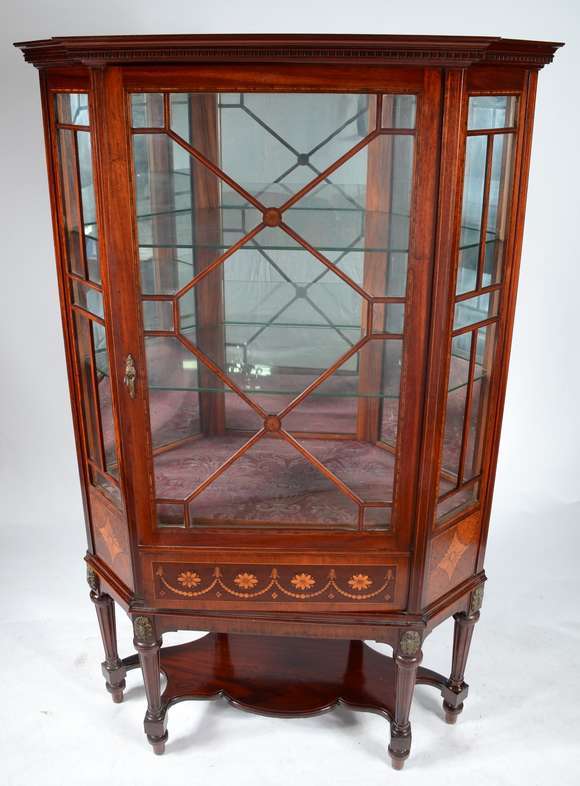 Vitrine de canto de madeira nobre, detalhes em marqueterie, fundo espelhado com prateleiras internas de vidro, pernas...