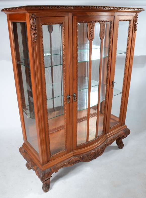 Vitrine de madeira nobre com portas e laterais de vidro bisotado, saia entalhada, prateleiras internas e fundo espelh...