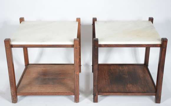 Par de mesas laterais de jacarandá e laminado, tampos de mármore branco (falhas no laminado). Anos 1960.