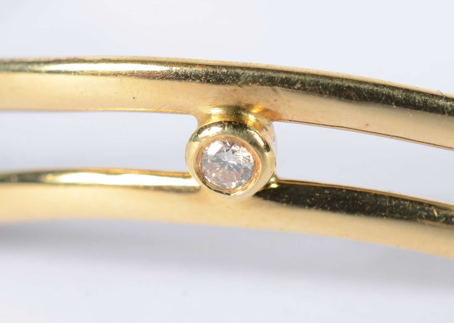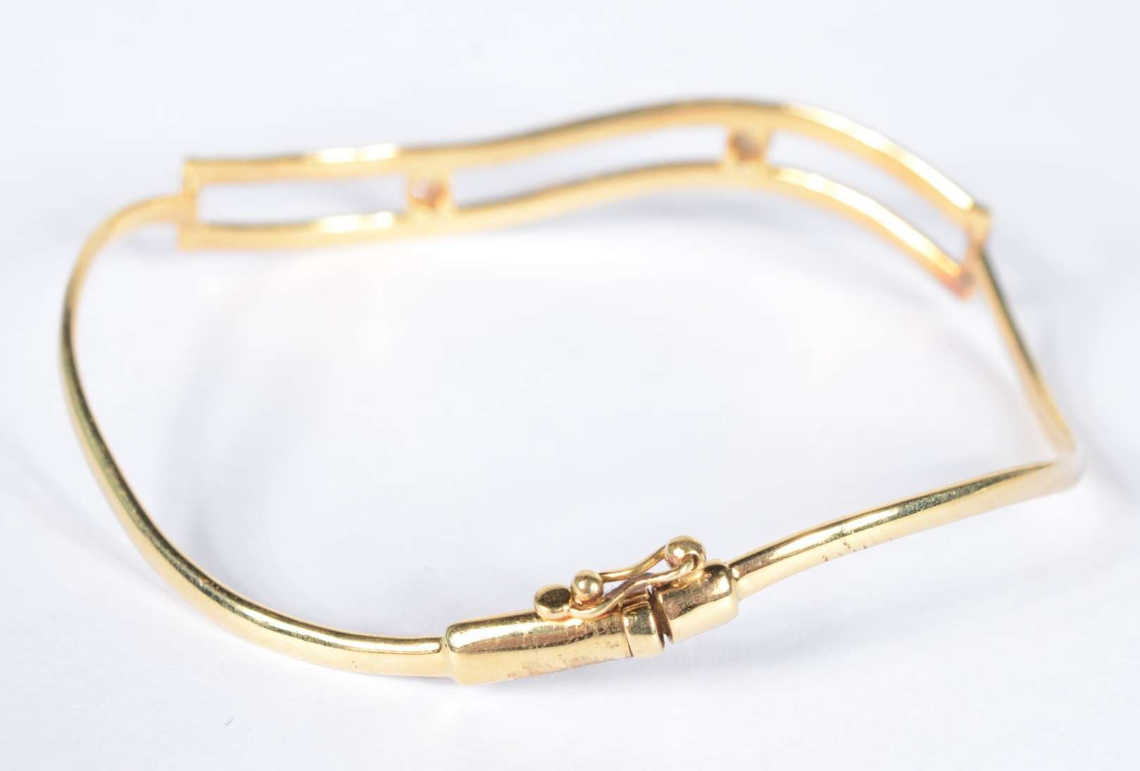 Pulseira de ouro 18 k., contraste 750 mls com dois brilhantes. (Por motivos de segurança a peça não se encontra na loja).