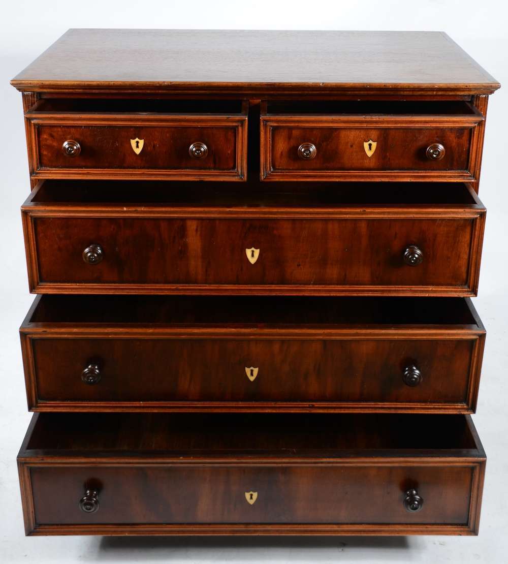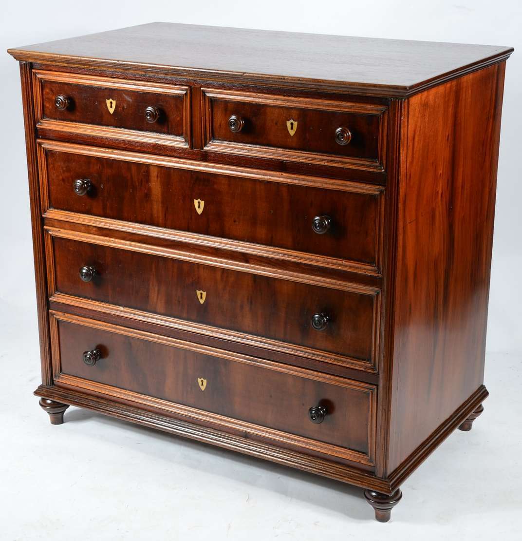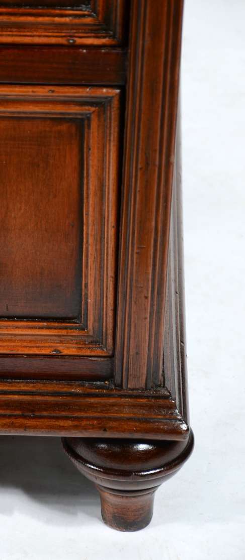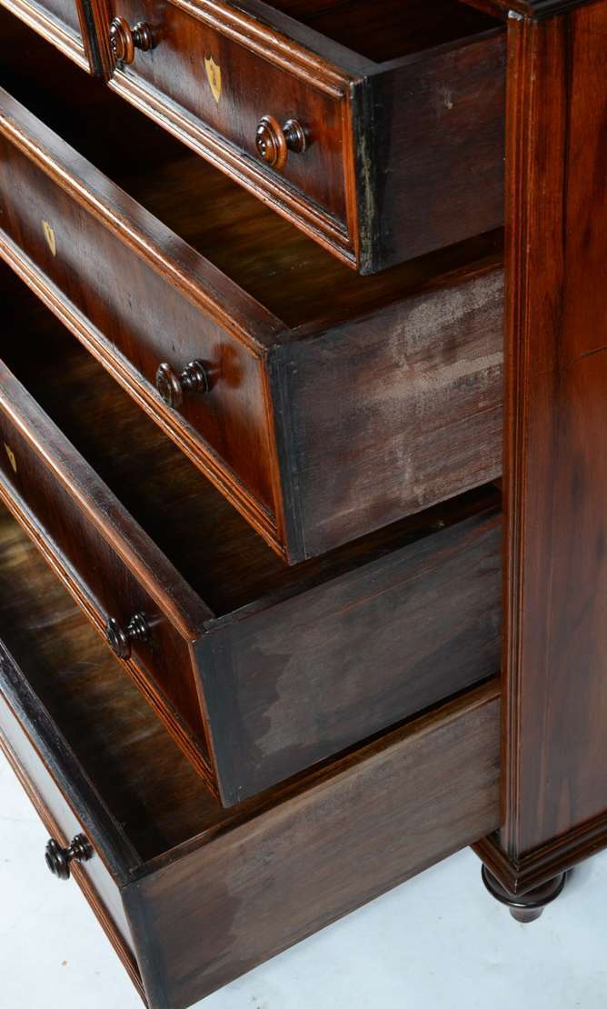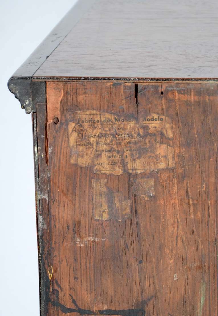 Cômoda de madeira nobre, três gavetões e duas gavetas com puxadores de metal, estilo Luiz XV.