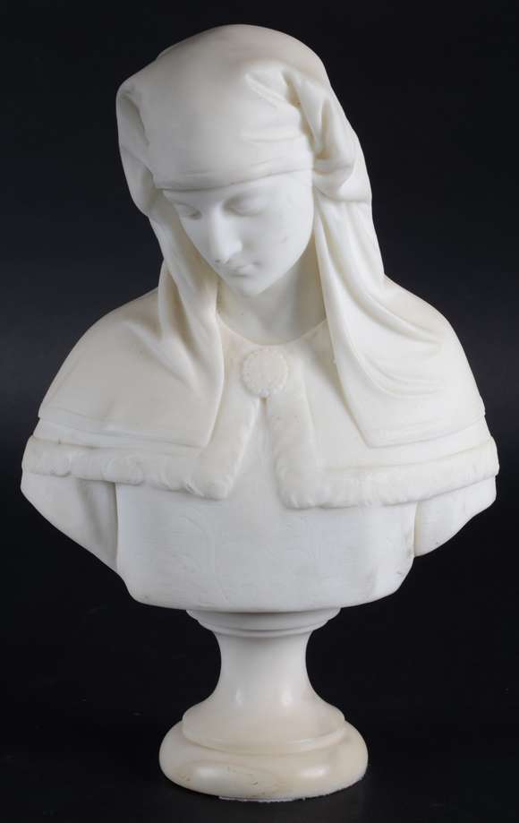 Busto de mármore representando figura feminina. Assinada. Restauro na base.