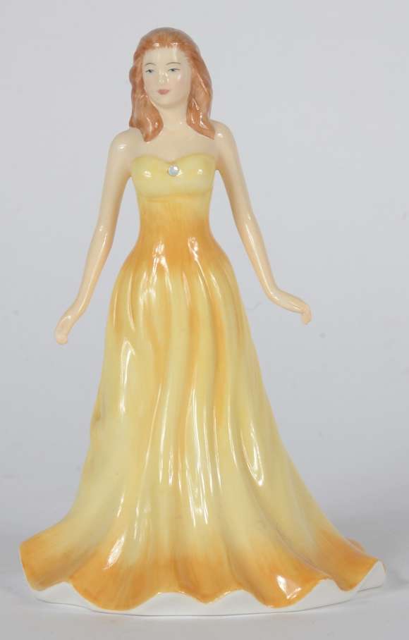 Escultura de porcelana inglesa representando dama de vestido amarelo.