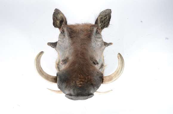 Escultura de resina na forma de chifre com animais em relevo, base de madeira.