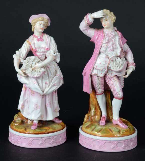 Par de esculturas de porcelana representando casal de nobres. Quebrados e colados.