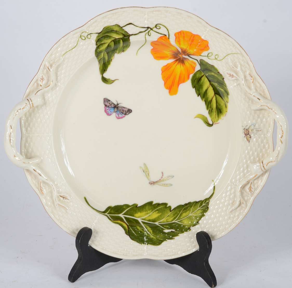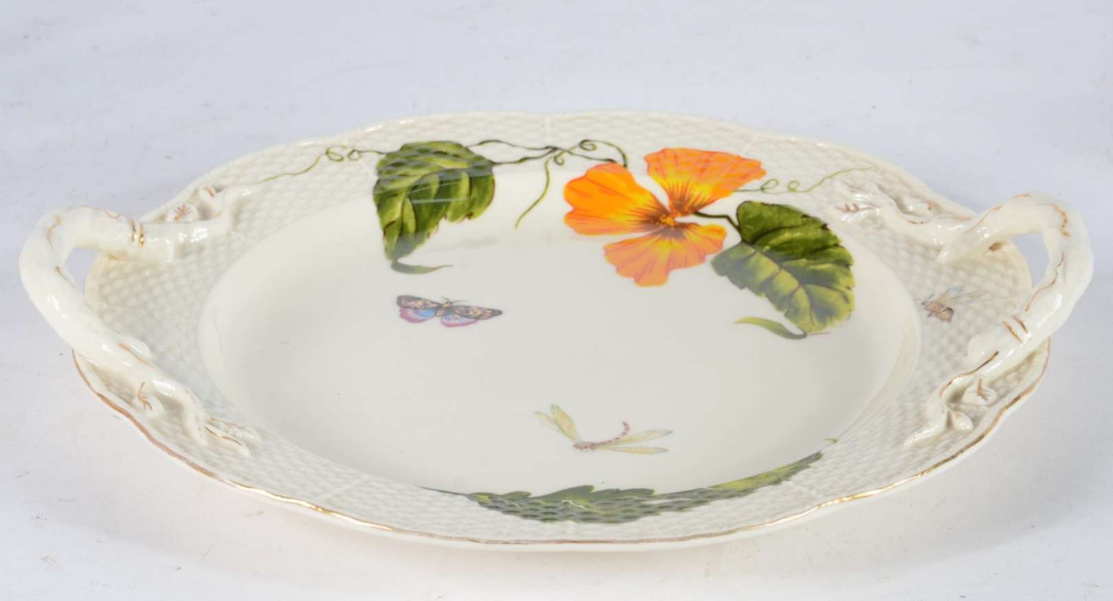 Espelho de cristal com moldura recortada e dourada.