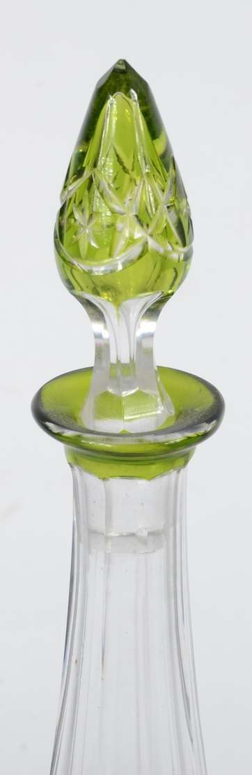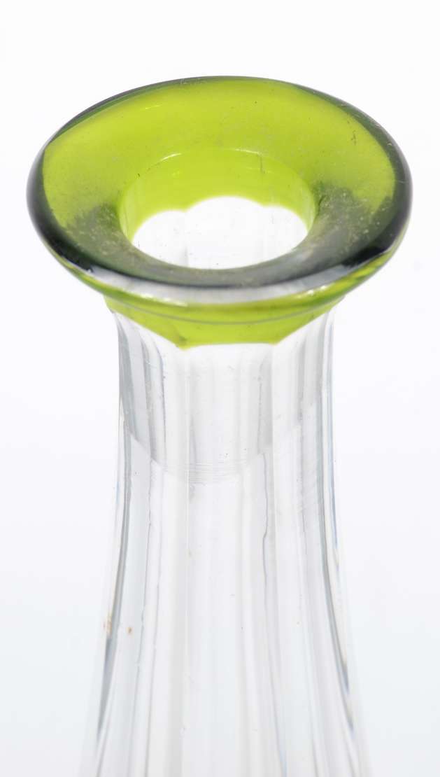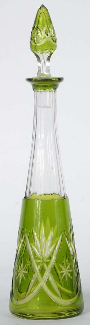 Garrafa de cristal europeu lapidado, gargalo de metal (pequenos amassados). Sem tampa.