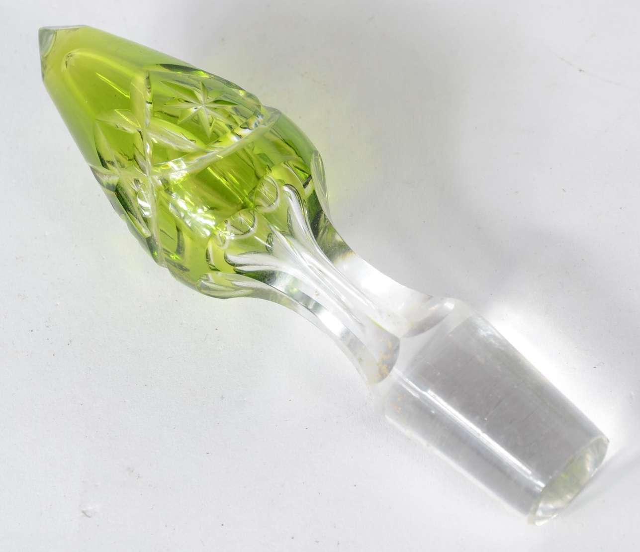 Par de garrafas de cristal lapidadas em gomos. Mofadas, tampas lascadas na parte interna. No estado.