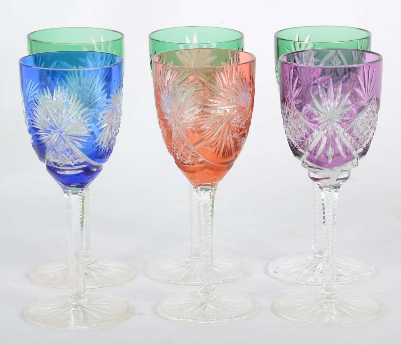 Serviço de cristal lapidado, composto de: 6 taças para vinho (um bicado), 9 copos para água, 7 para champange e 8 par...