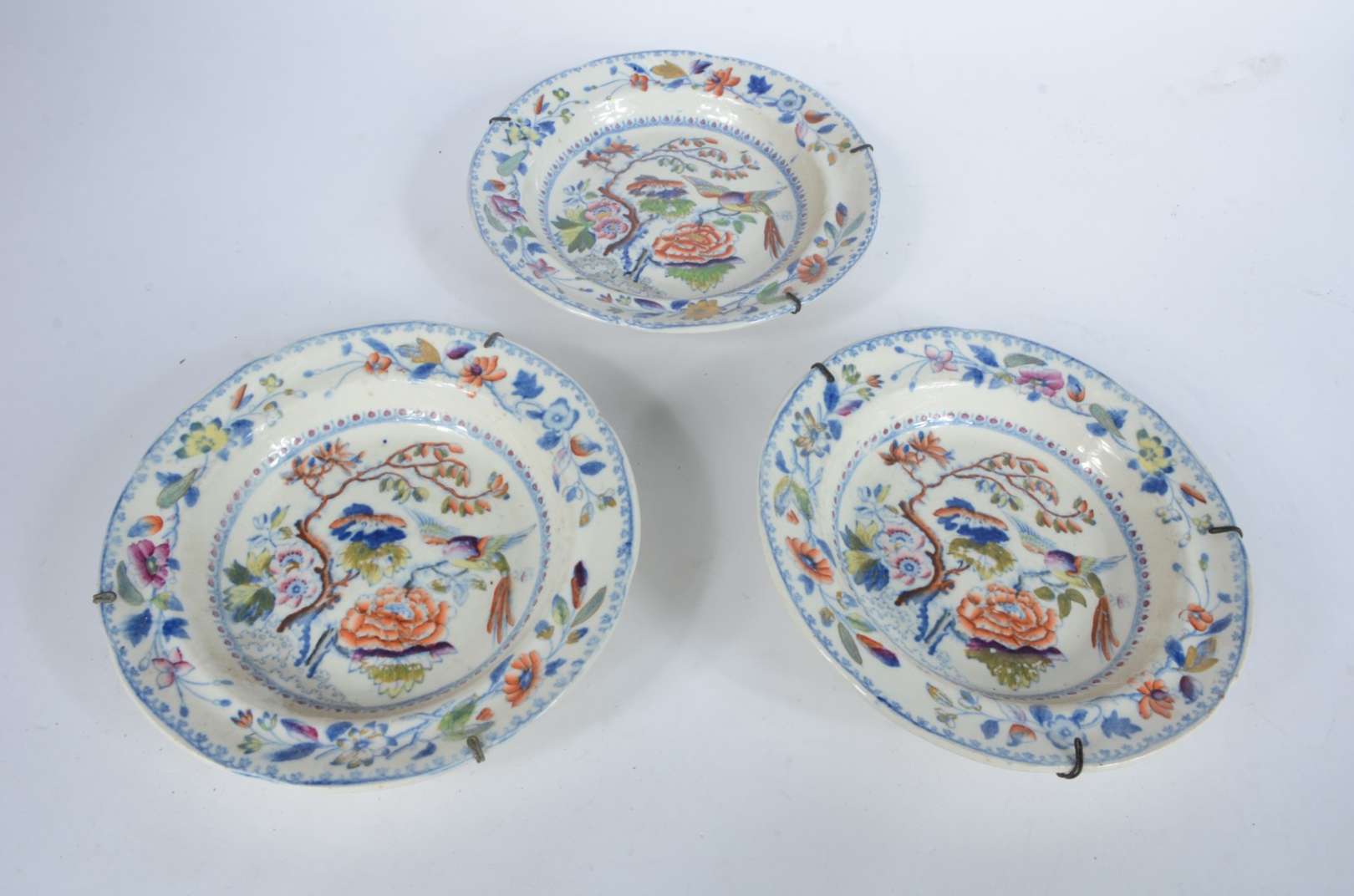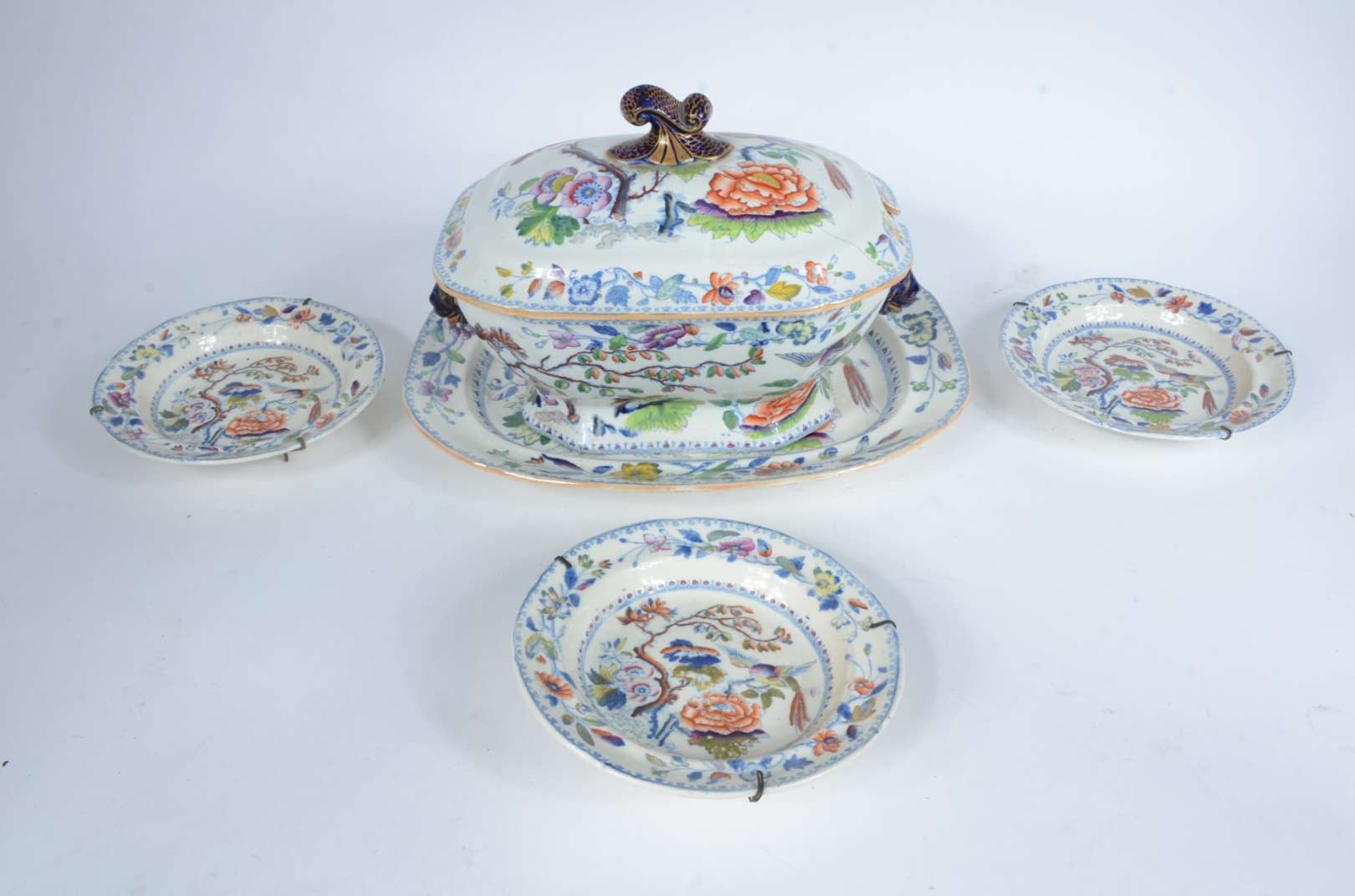 Aparelho de jantar de porcelana com flores em policromia, composto de: 12 pratos rasos, 12 pratos fundos, 12 pratos ...