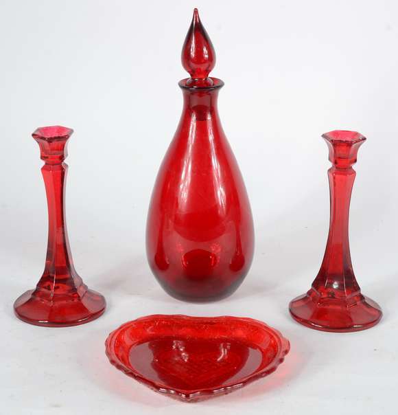 Quatro peças diversas de vidro vermelho, sendo: par de castiçais; garrafa e prato "coração".