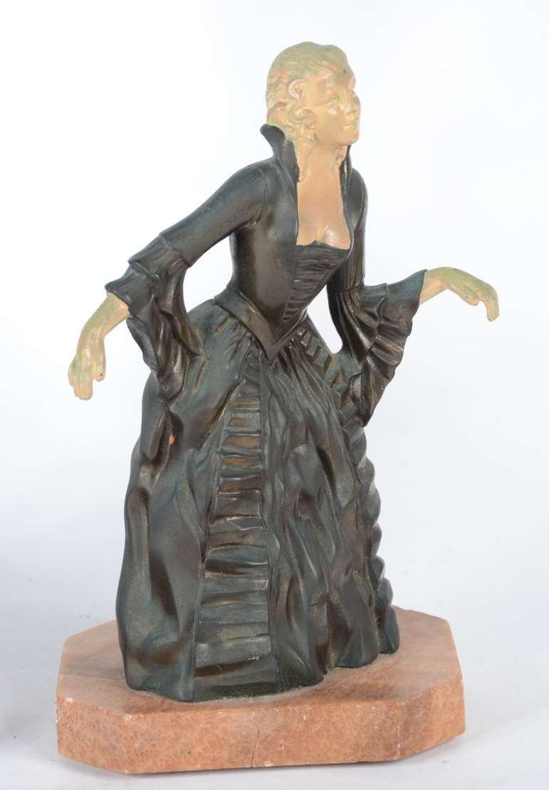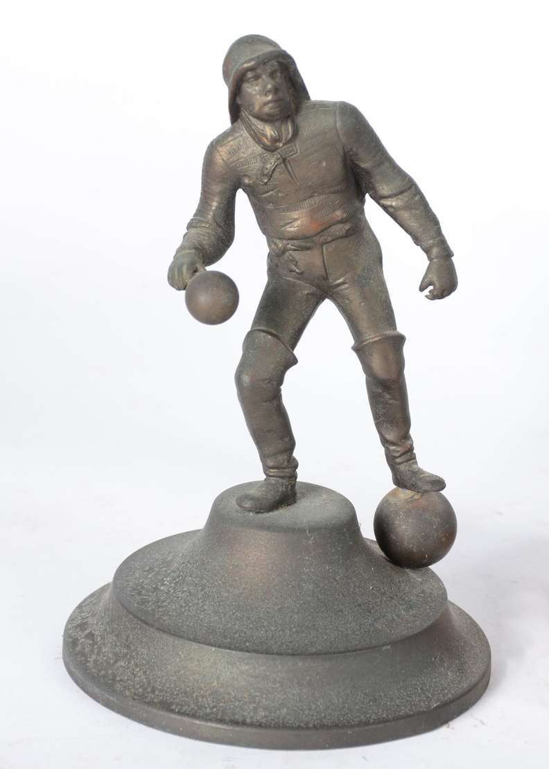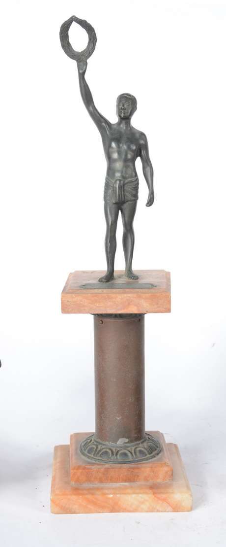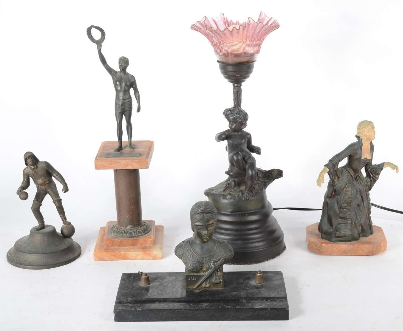 Cinco estatuetas diversas de metal. Desgastes e partes faltantes.
