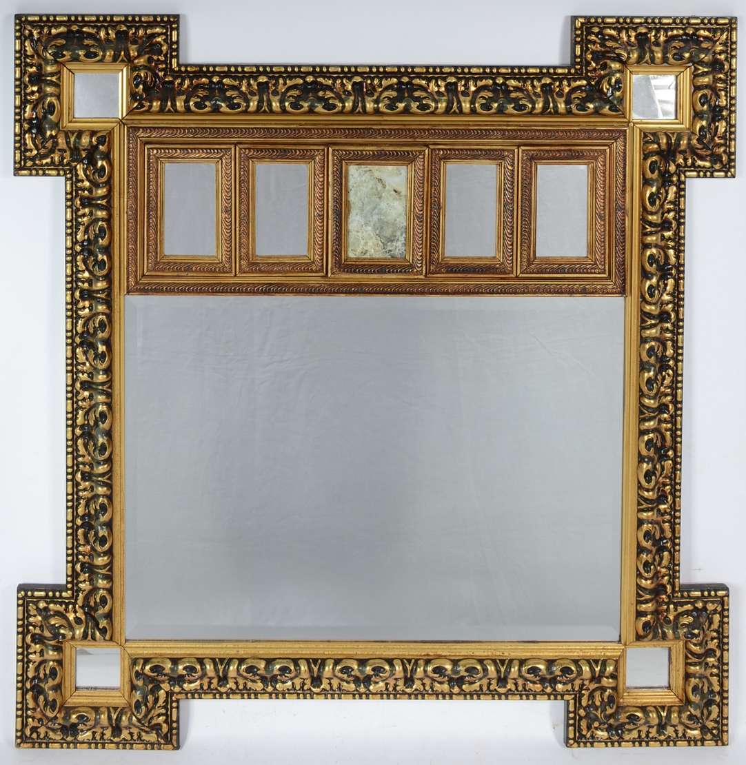 Espelho de cristal com moldura recortada e dourada.