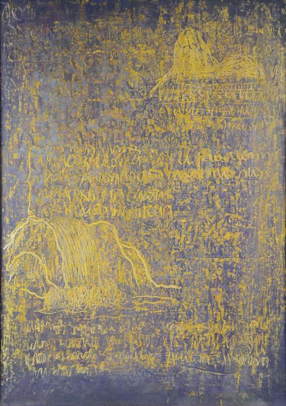 Quadro decorativo com figura de Madona de madeira e outros materiais.