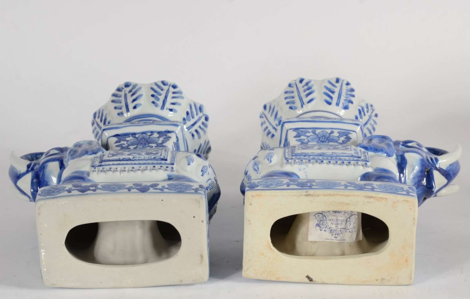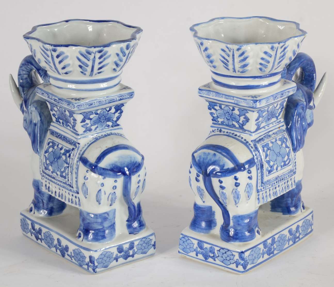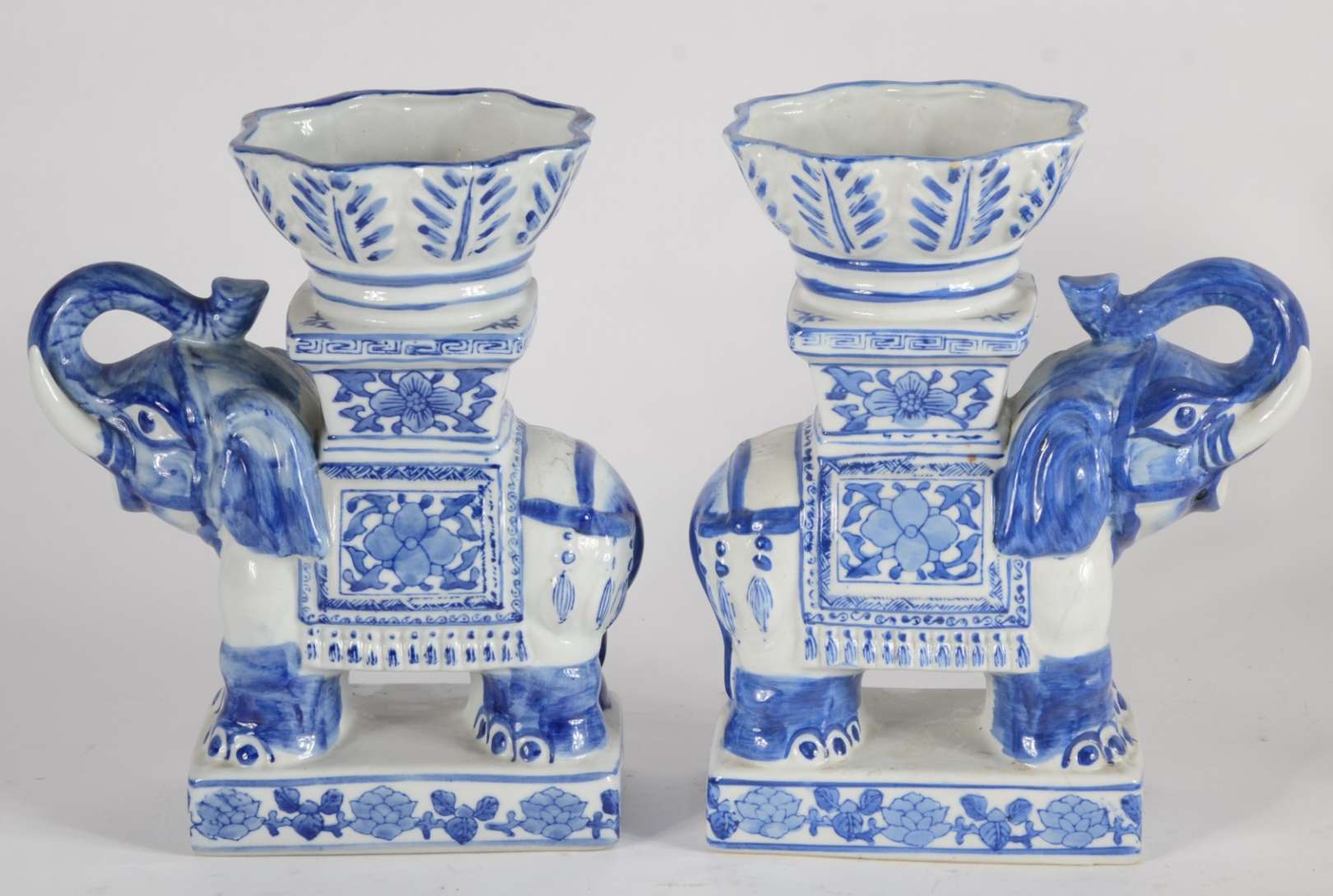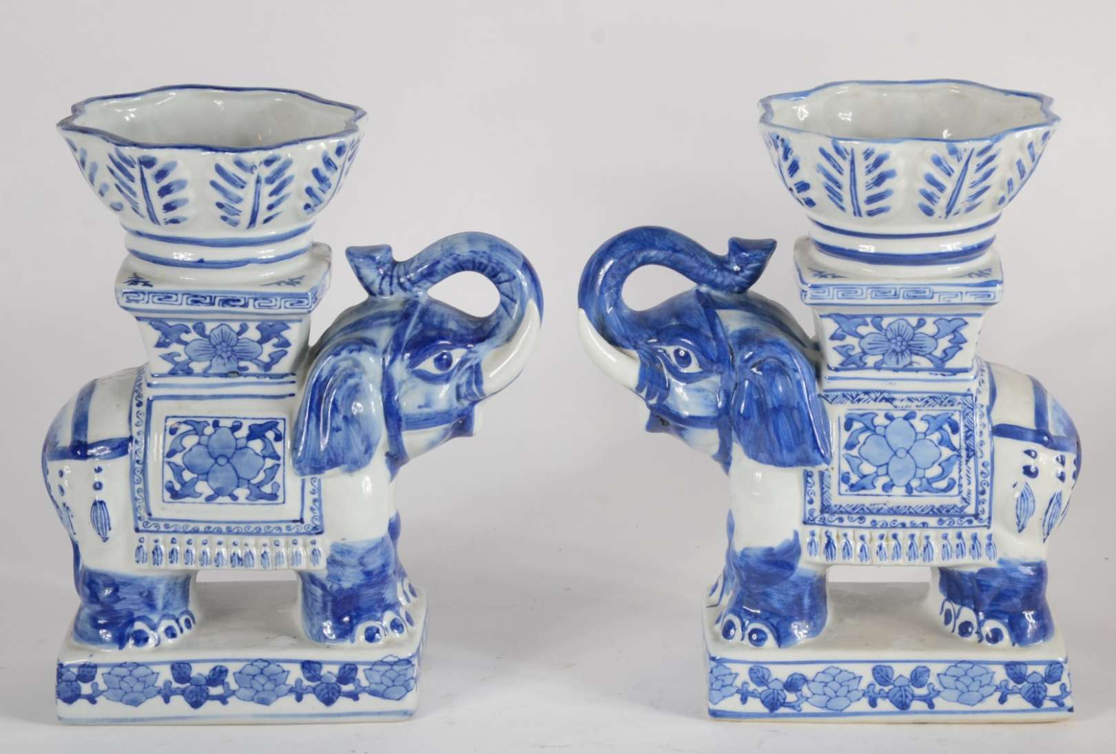 Par de esculturas de porcelana oriental azul e branca na forma de elefantes.