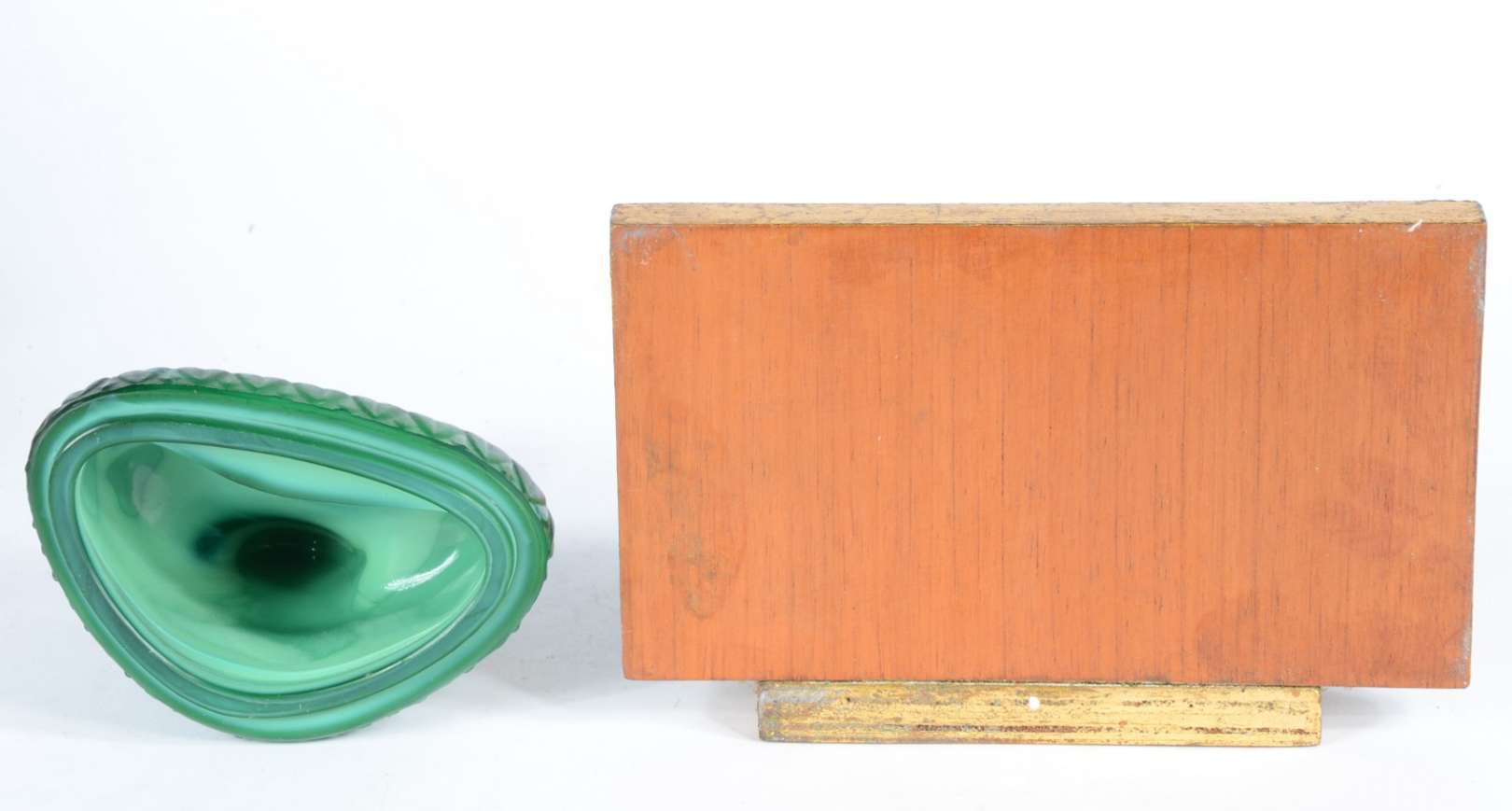 Escultura de resina na forma de chifre com animais em relevo, base de madeira.