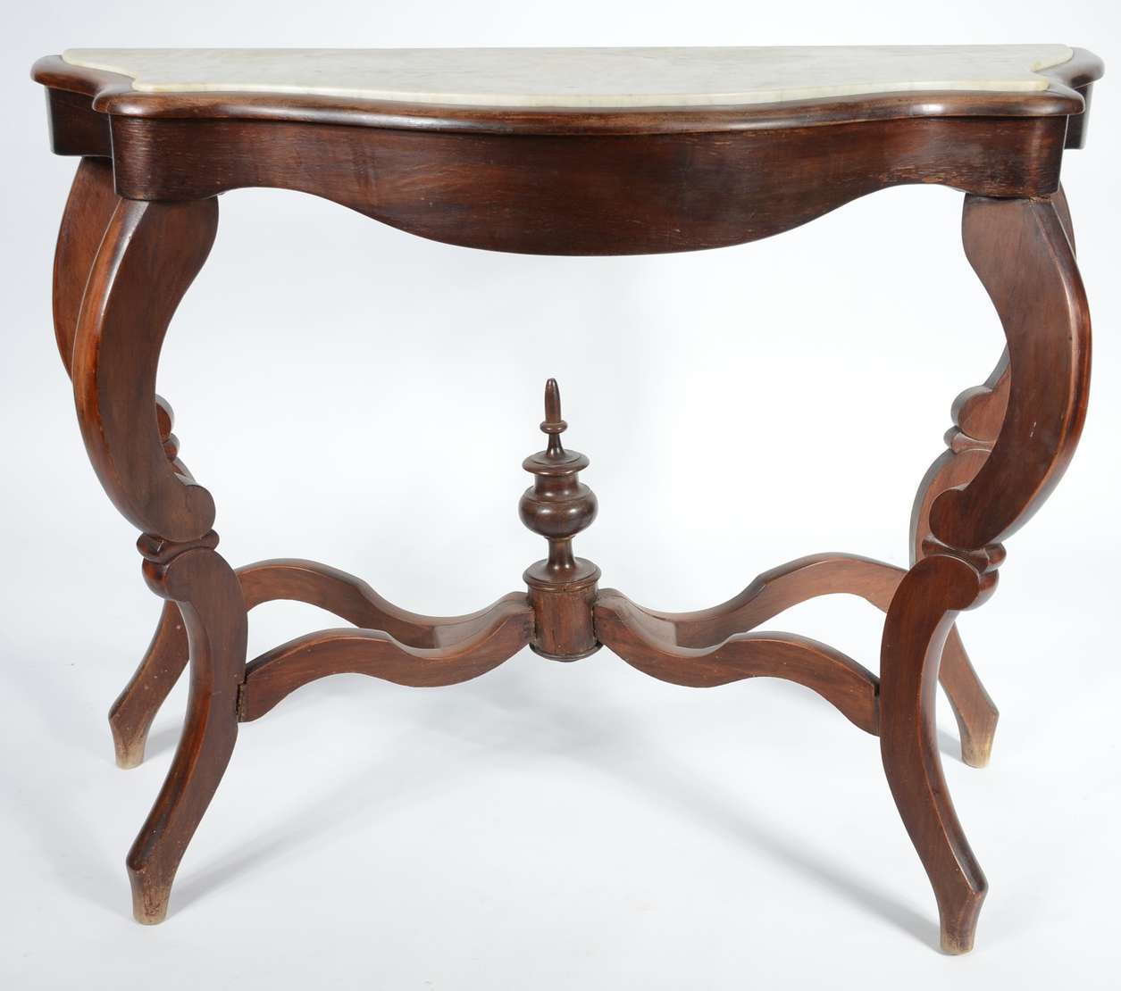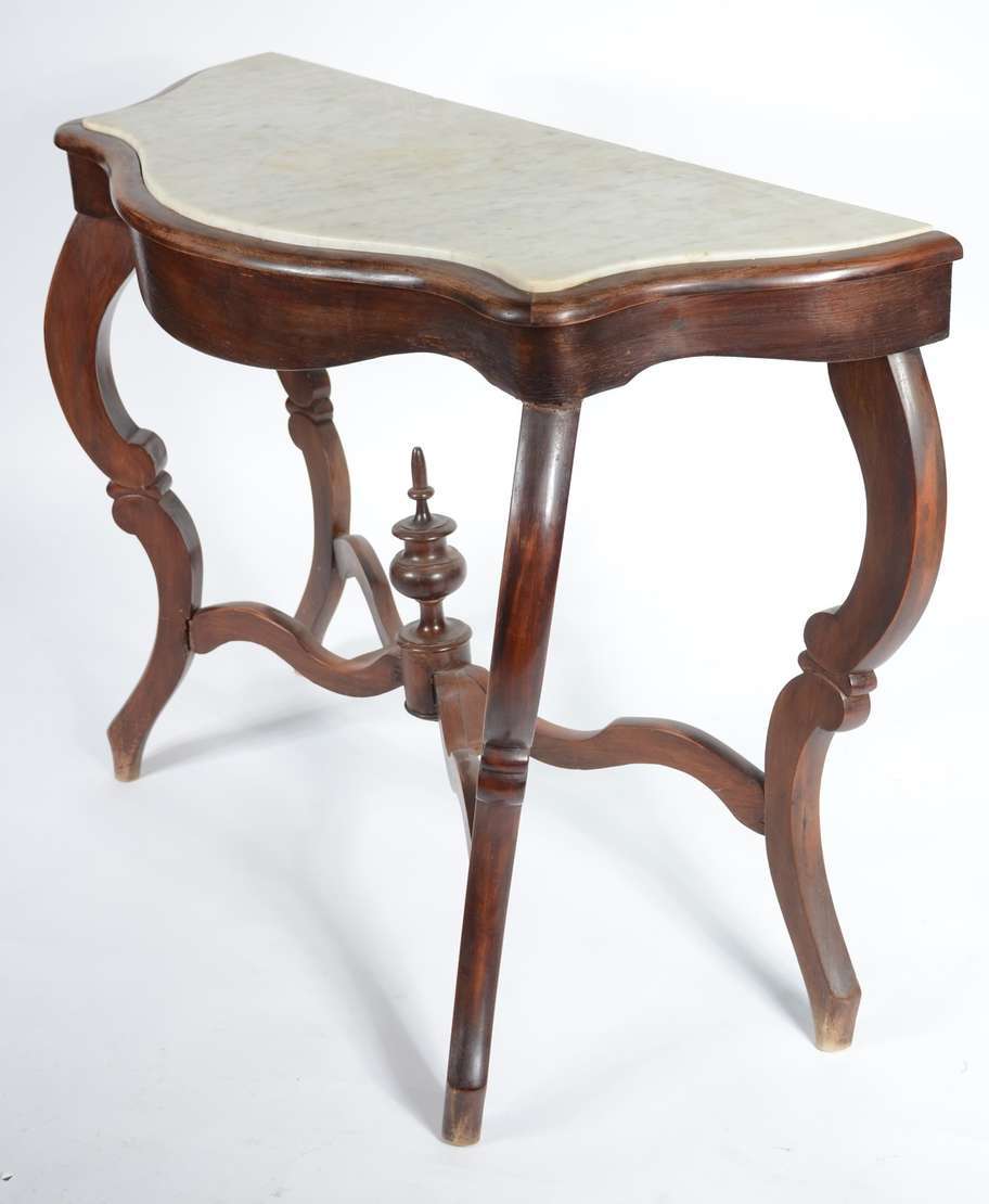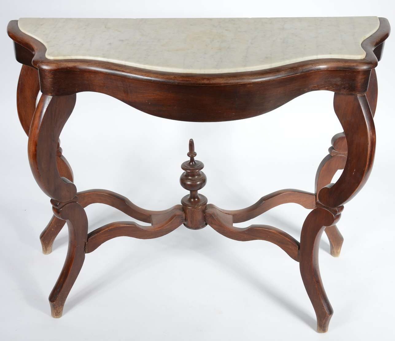 Mesa/ aparador de madeira nobre, saia recortada, quatro pernas torneadas. Manchas no tampo e restauro.