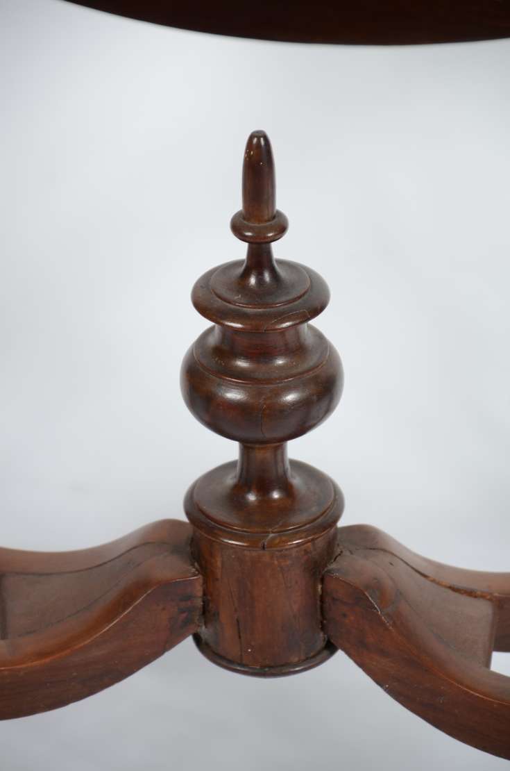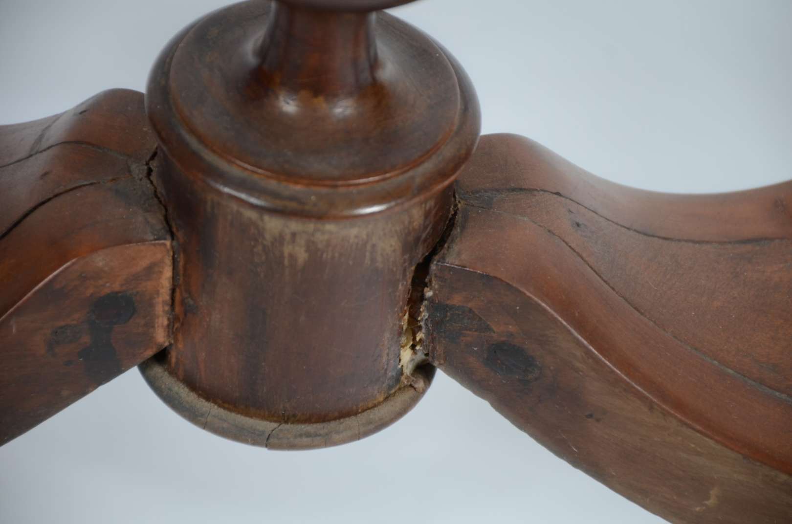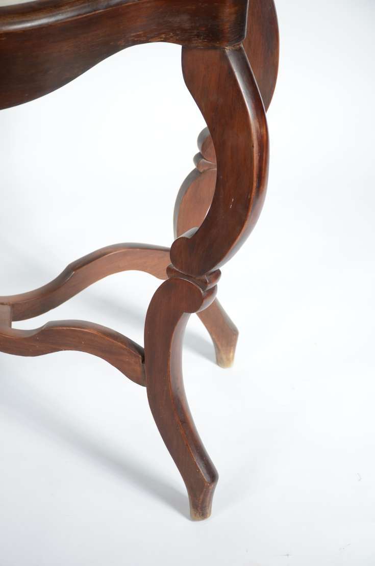 Mesa/ aparador de madeira nobre, saia recortada, quatro pernas torneadas. Manchas no tampo e restauro.