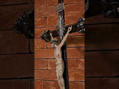 Crucifixo de madeira nobre com figura de Cristo ricamente esculpida em marfim policromado, resplendor e placa de prata de lei.