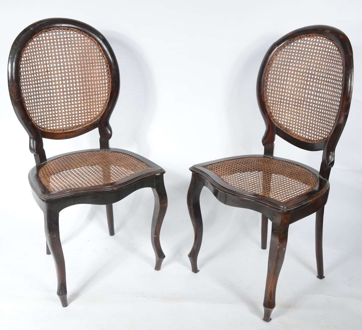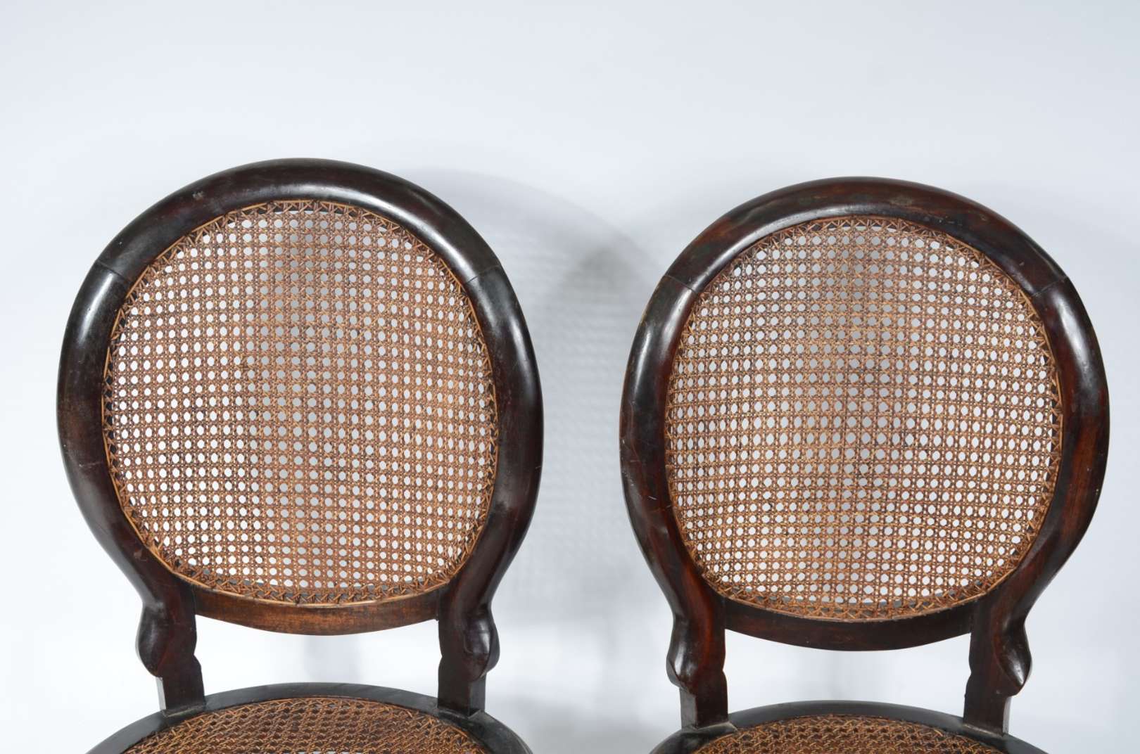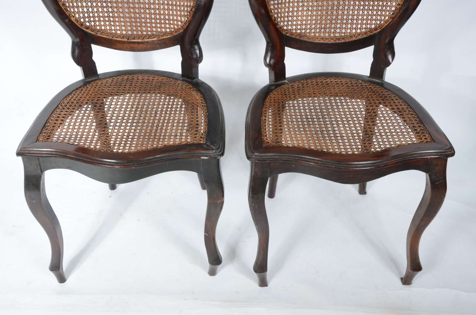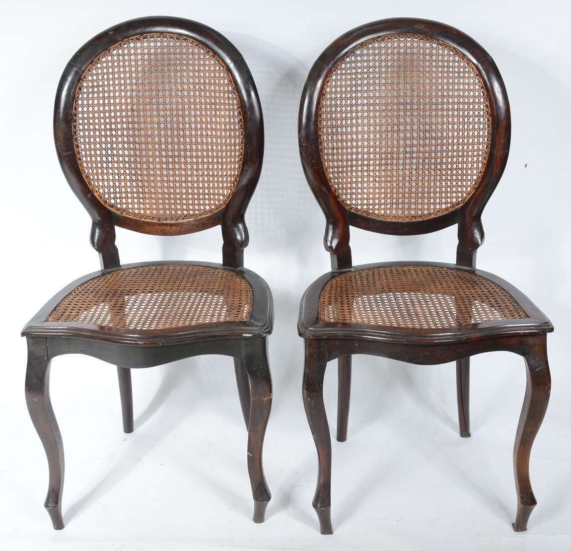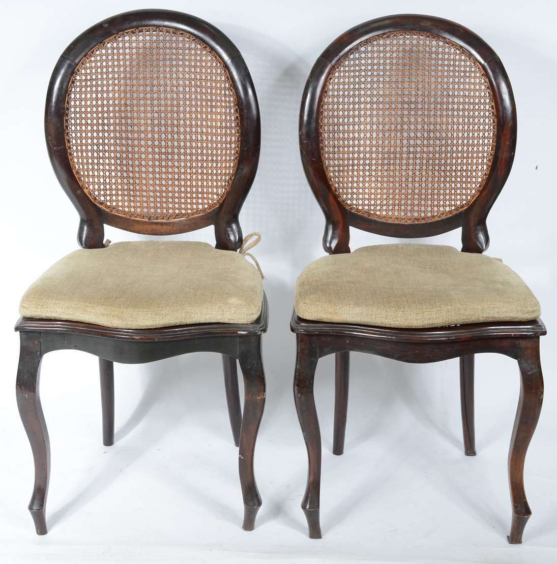 Par de cadeiras de madeira nobre, estofadas e forradas com tecido na cor bege. Estilo inglês vitoriano.