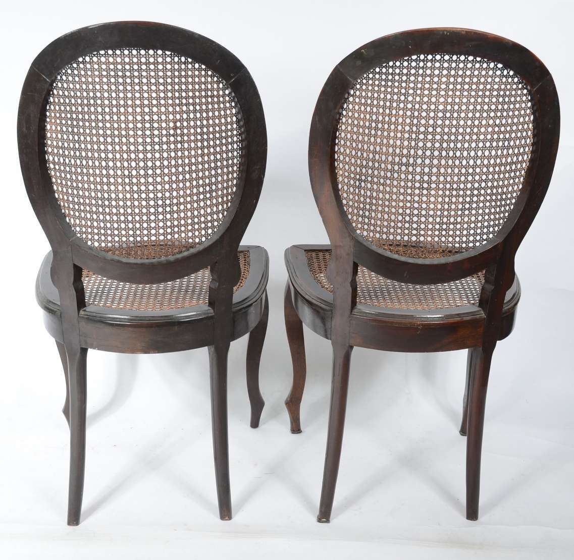 Par de mesas laterais de madeira nobre com porta frontal e laterais almofadadas. Desgastes.
