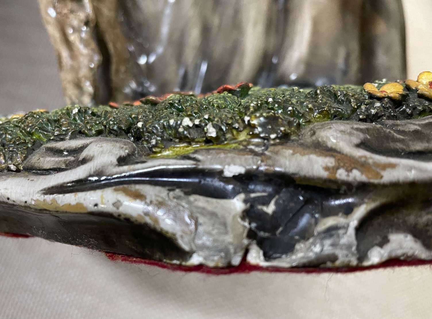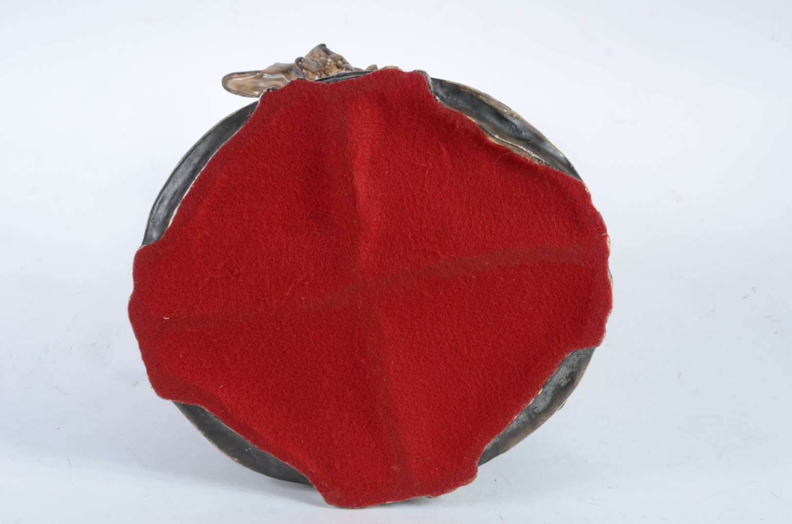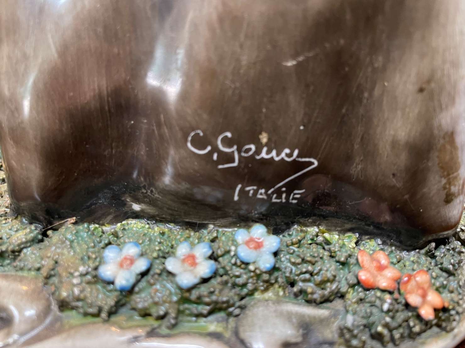 Escultura de bronze patinada, base de madeira com inicias R.C. Um pé quebrado, a escultura não está ficando em pé sob...