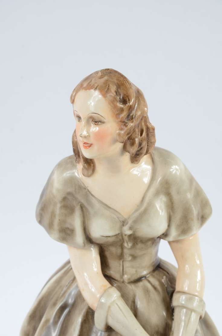 Estatueta de marfim policromado representando gueixa, base de madeira. Faltando a flor da mão esquerda. Perda de mate...