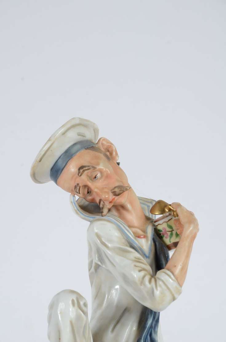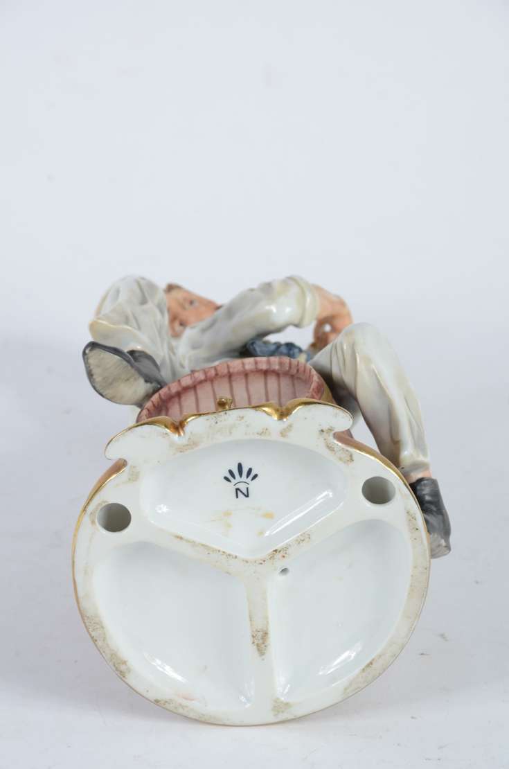Dois netsukes de marfim representando figuras com peixe e ventarola, bases assinadas.