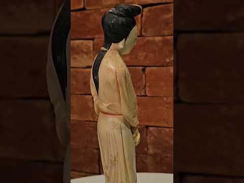 Escultura de jade representando menino, base de madeira.