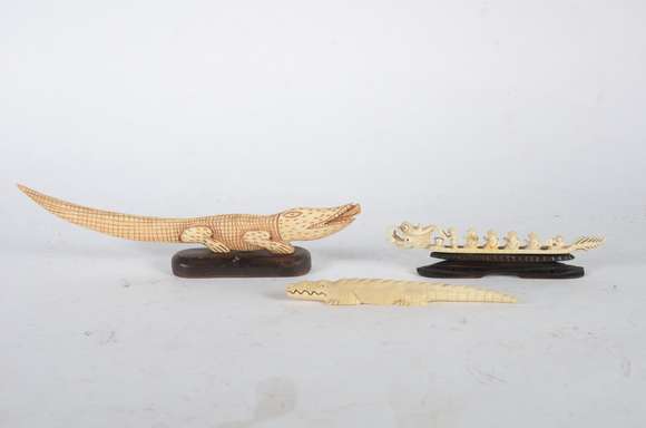 Três estatuetas de marfim, sendo: barca com figura de dragão na proa e dois jacarés. Duas peças com bases de madeira....