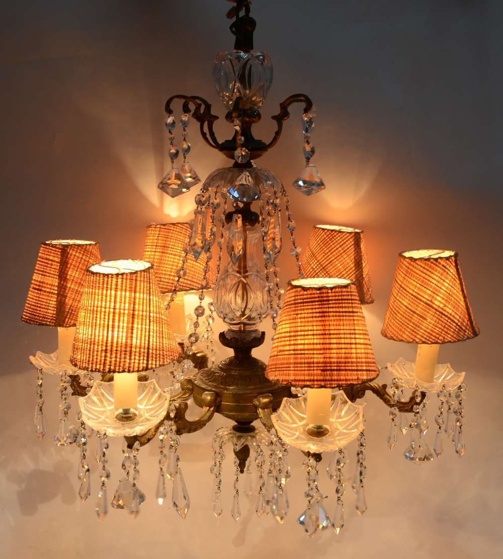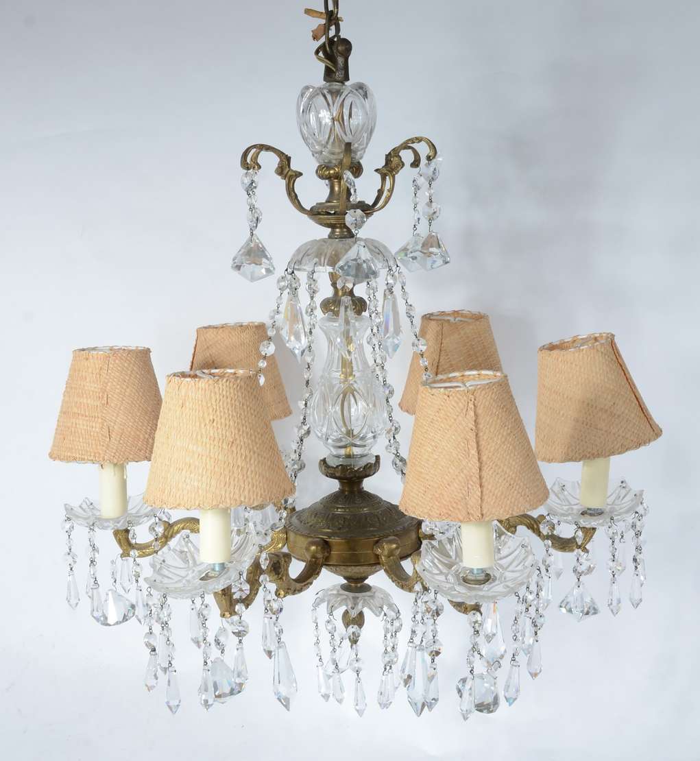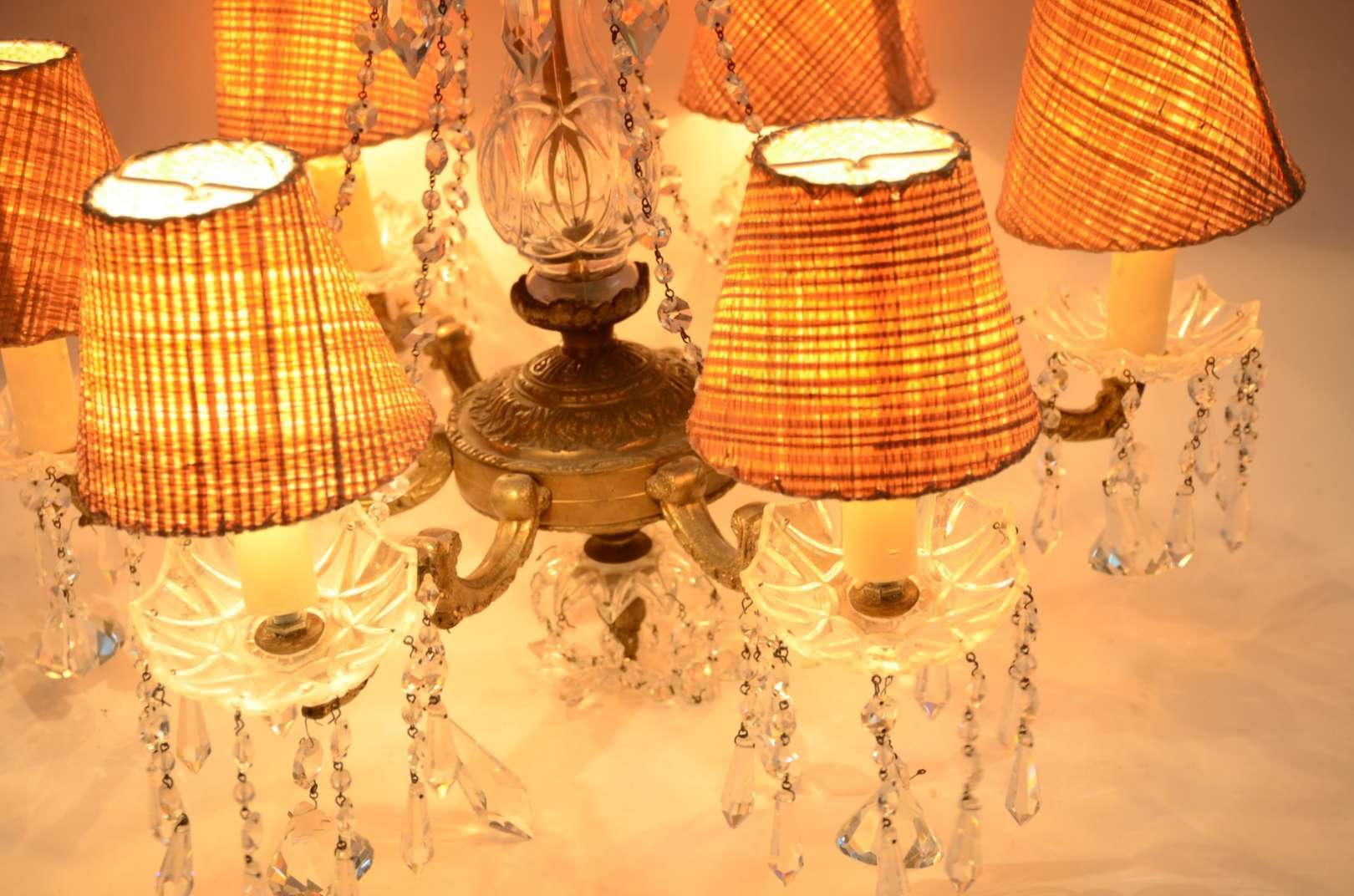 Lustre de metal e cristal, com 6 braços, mangas lapidadas, e detalhes com canutilhos. Precisando trocar fiação.