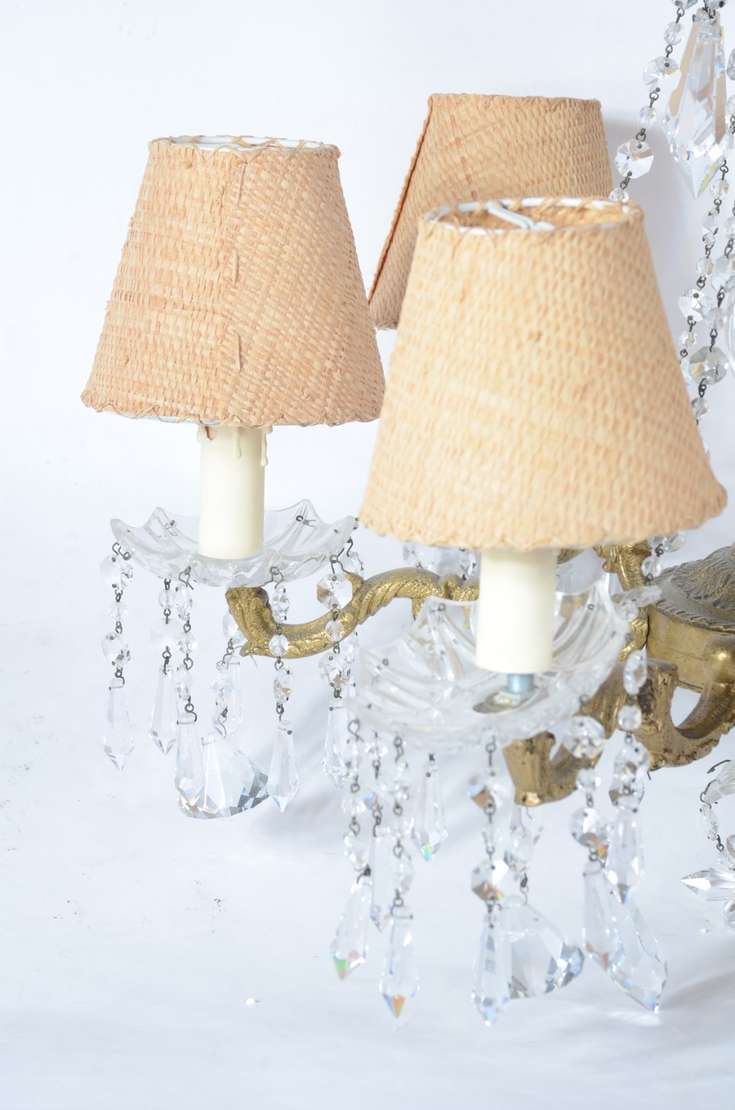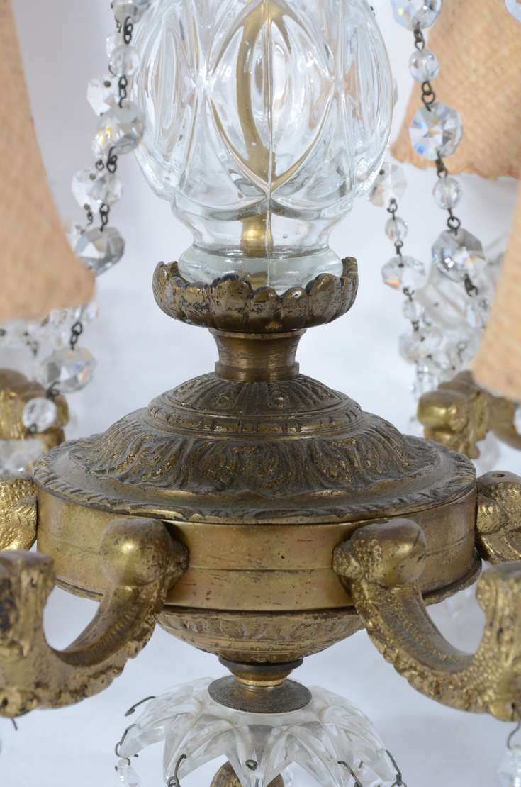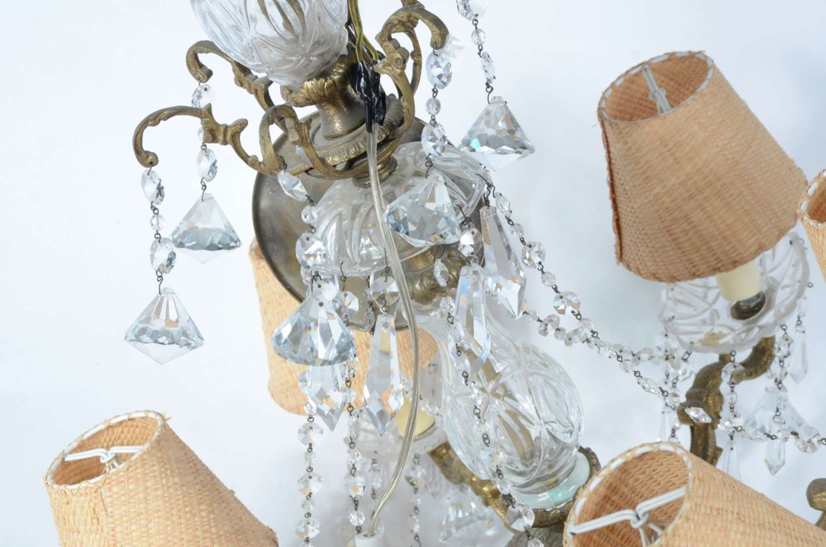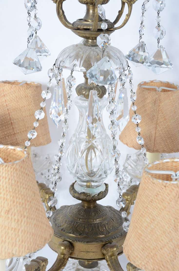 Lustre de metal e cristal, com 6 braços, mangas lapidadas, e detalhes com canutilhos. Precisando trocar fiação.