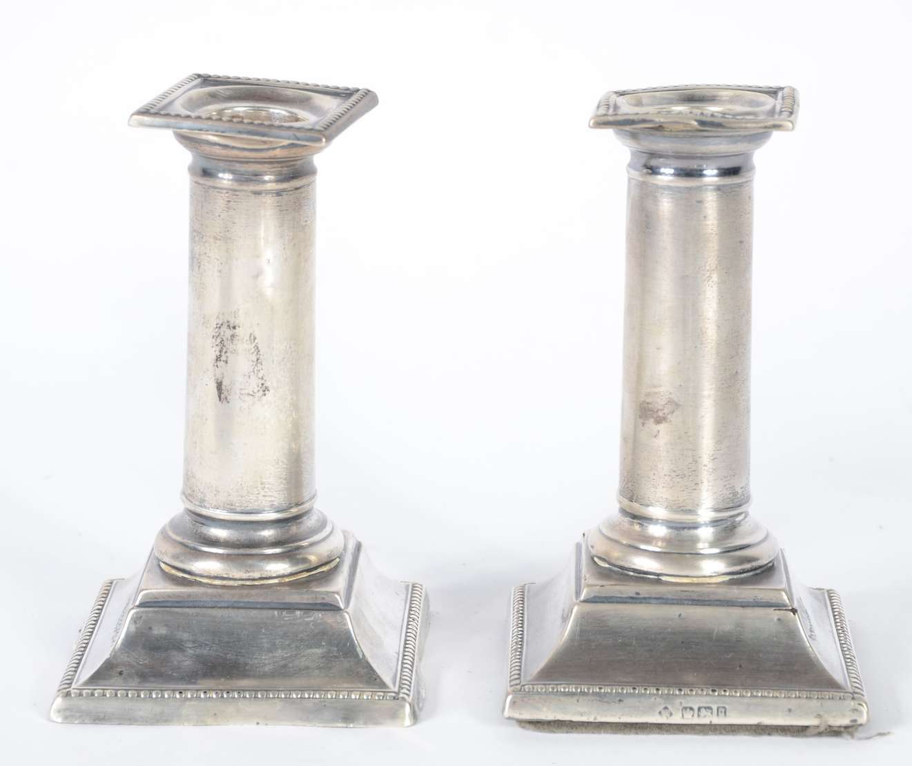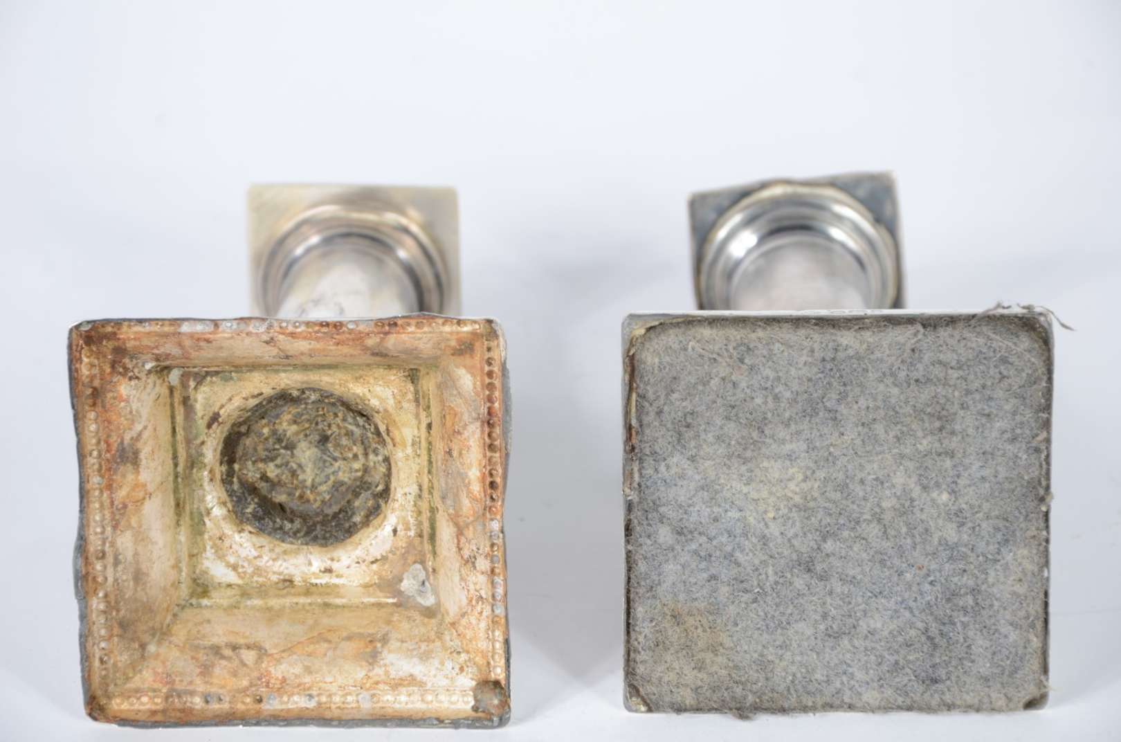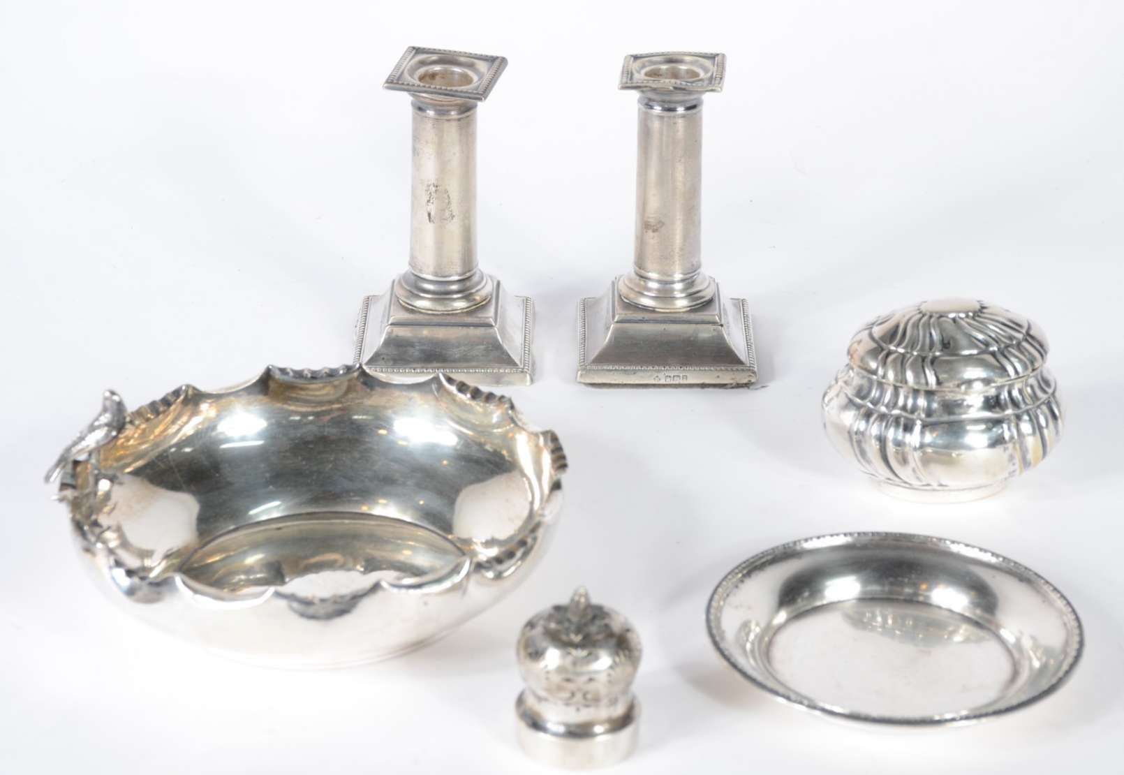 Três peças, sendo: balde de aço inox e par de castiçais de prata (partes faltantes, quebrados e amassados). Peso tota...