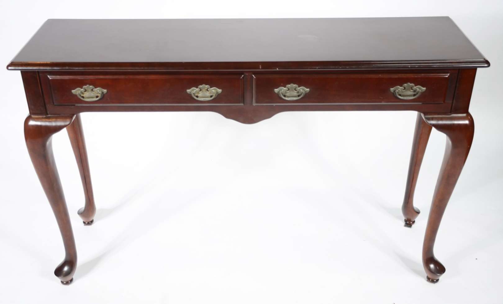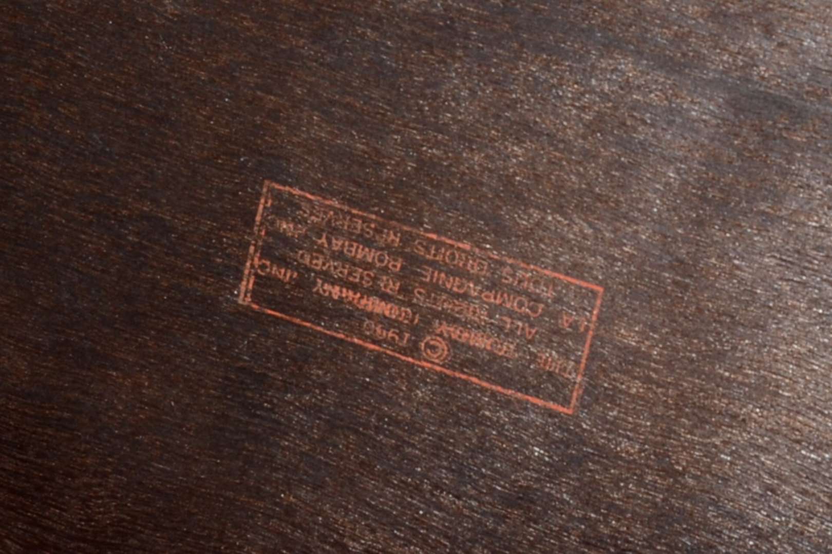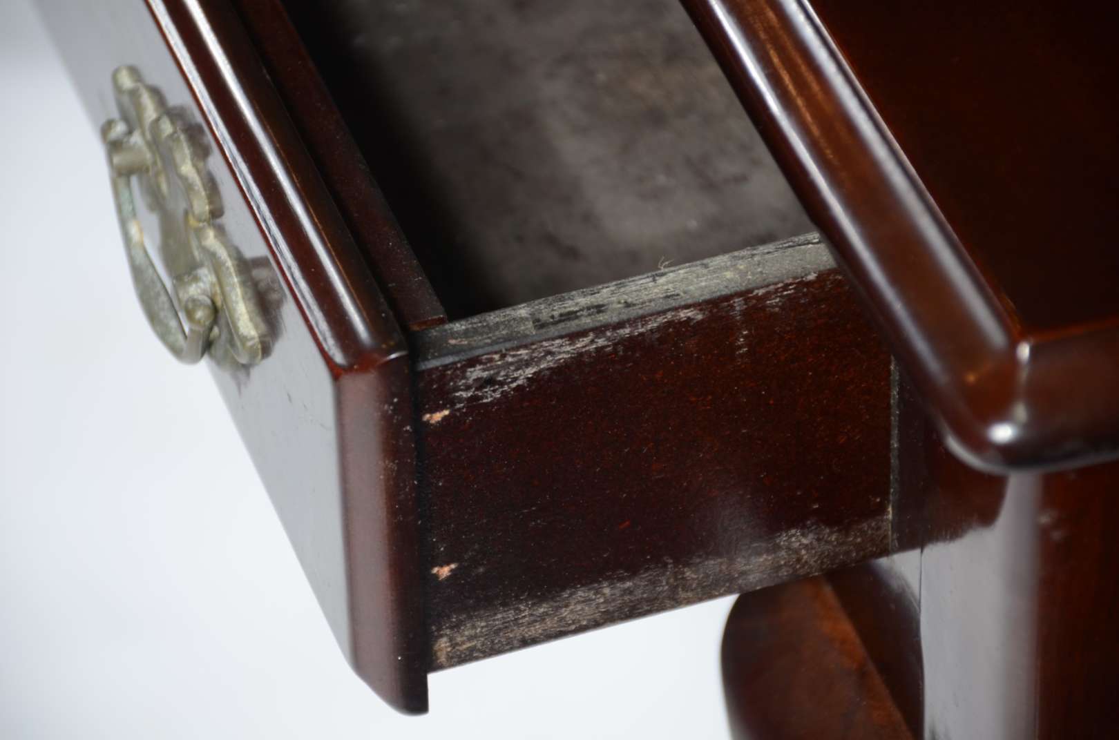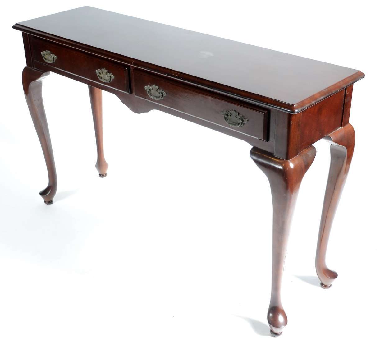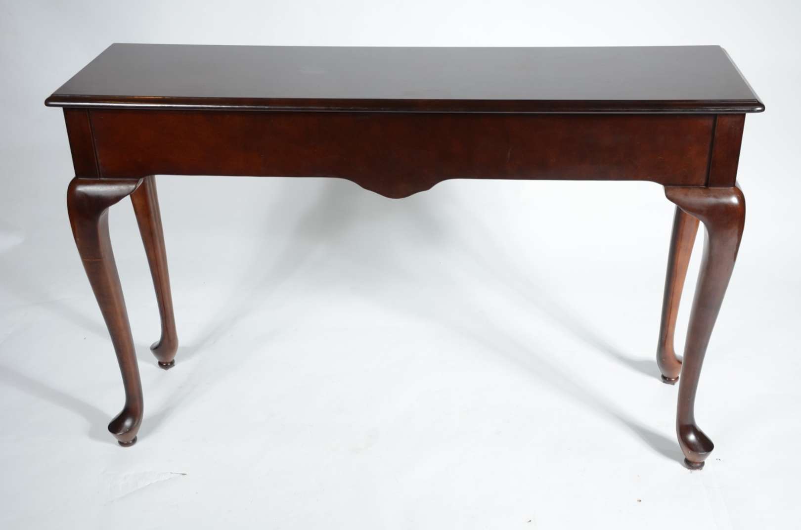 Mesa/ aparador de madeira nobre, saia recortada, quatro pernas torneadas. Manchas no tampo e restauro.