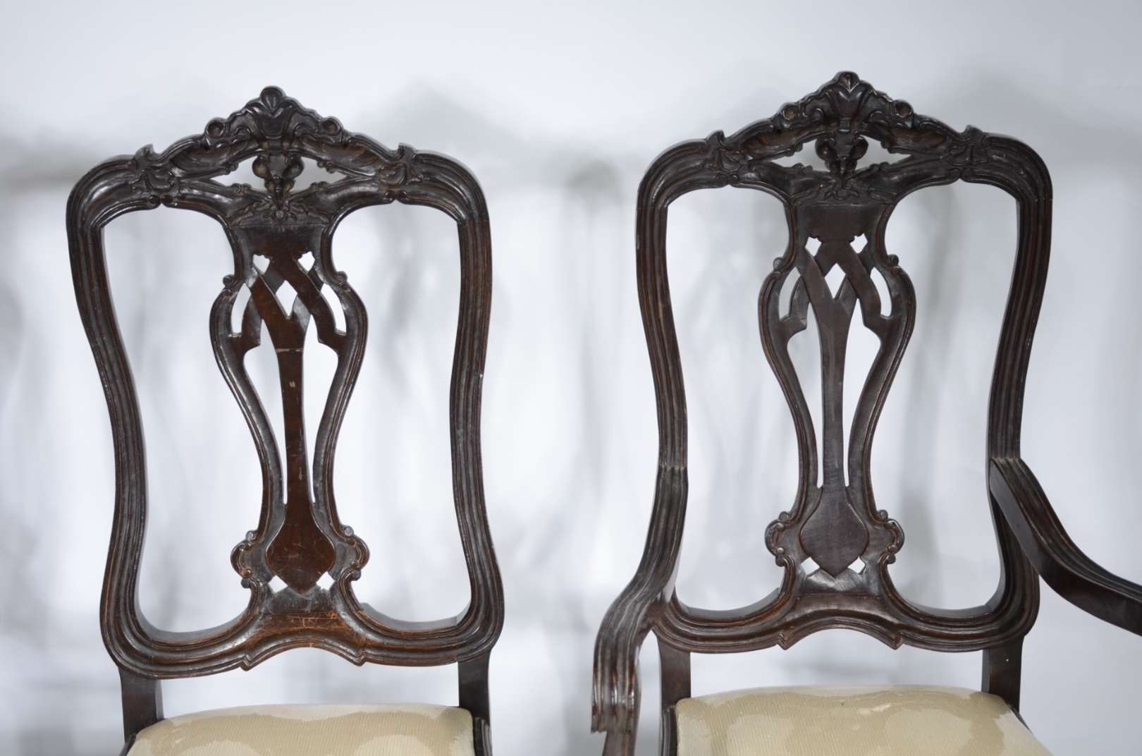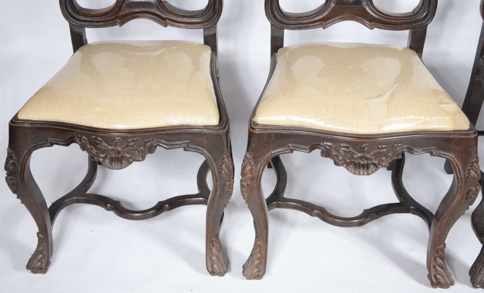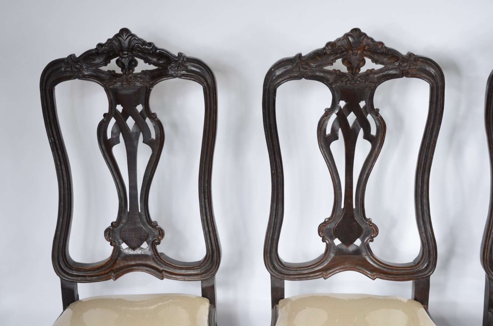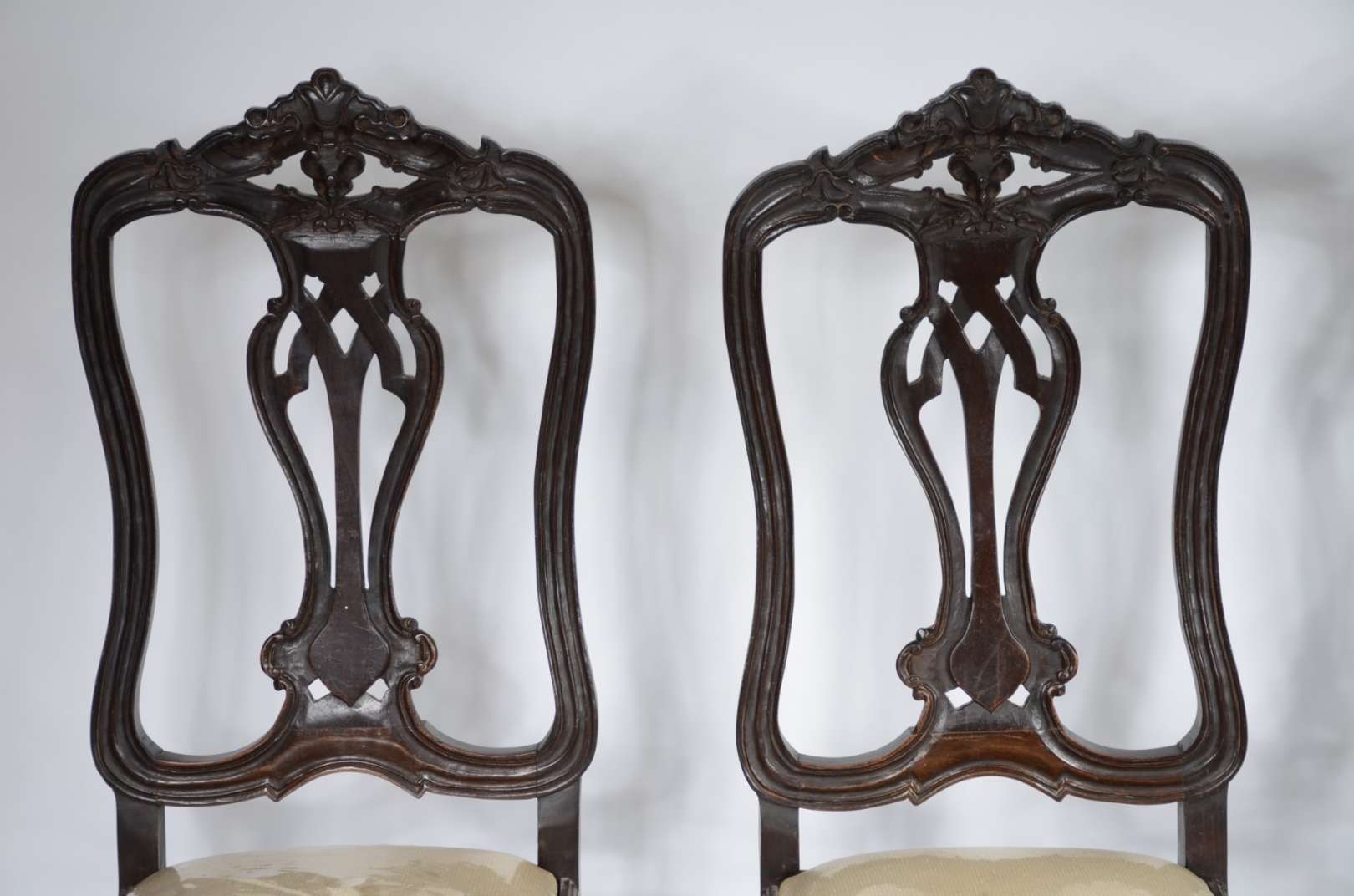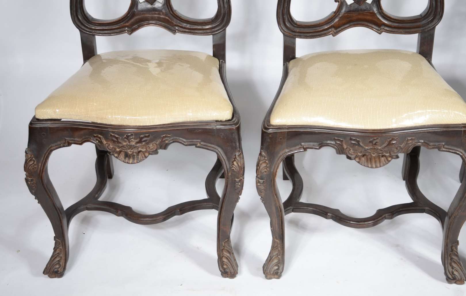 Par de cadeiras de madeira nobre, estofadas e forradas com tecido na cor bege. Estilo inglês vitoriano.