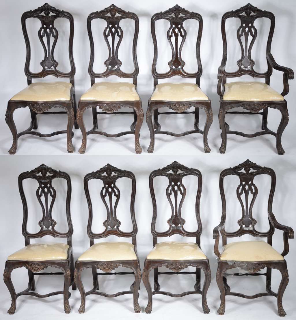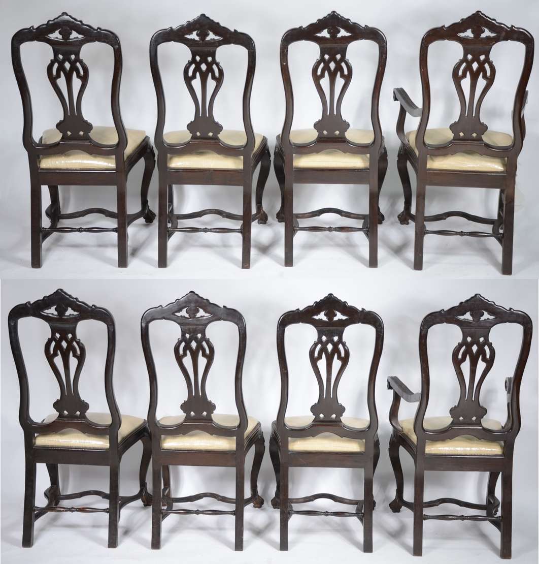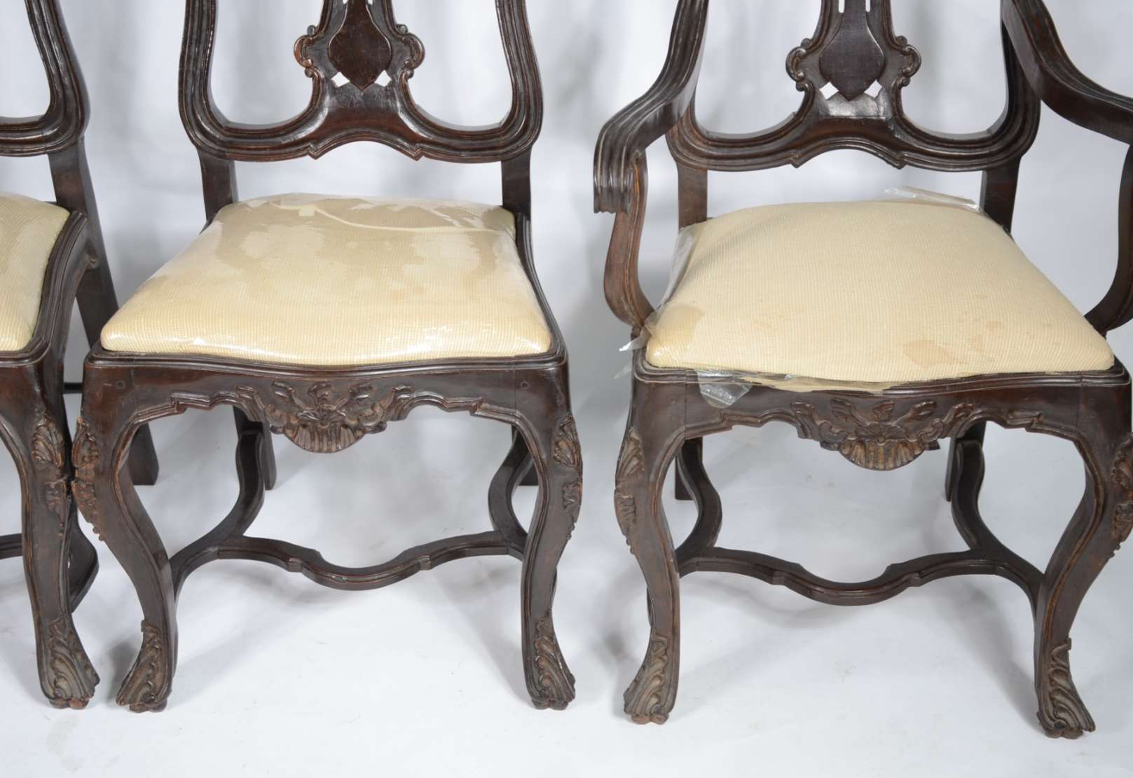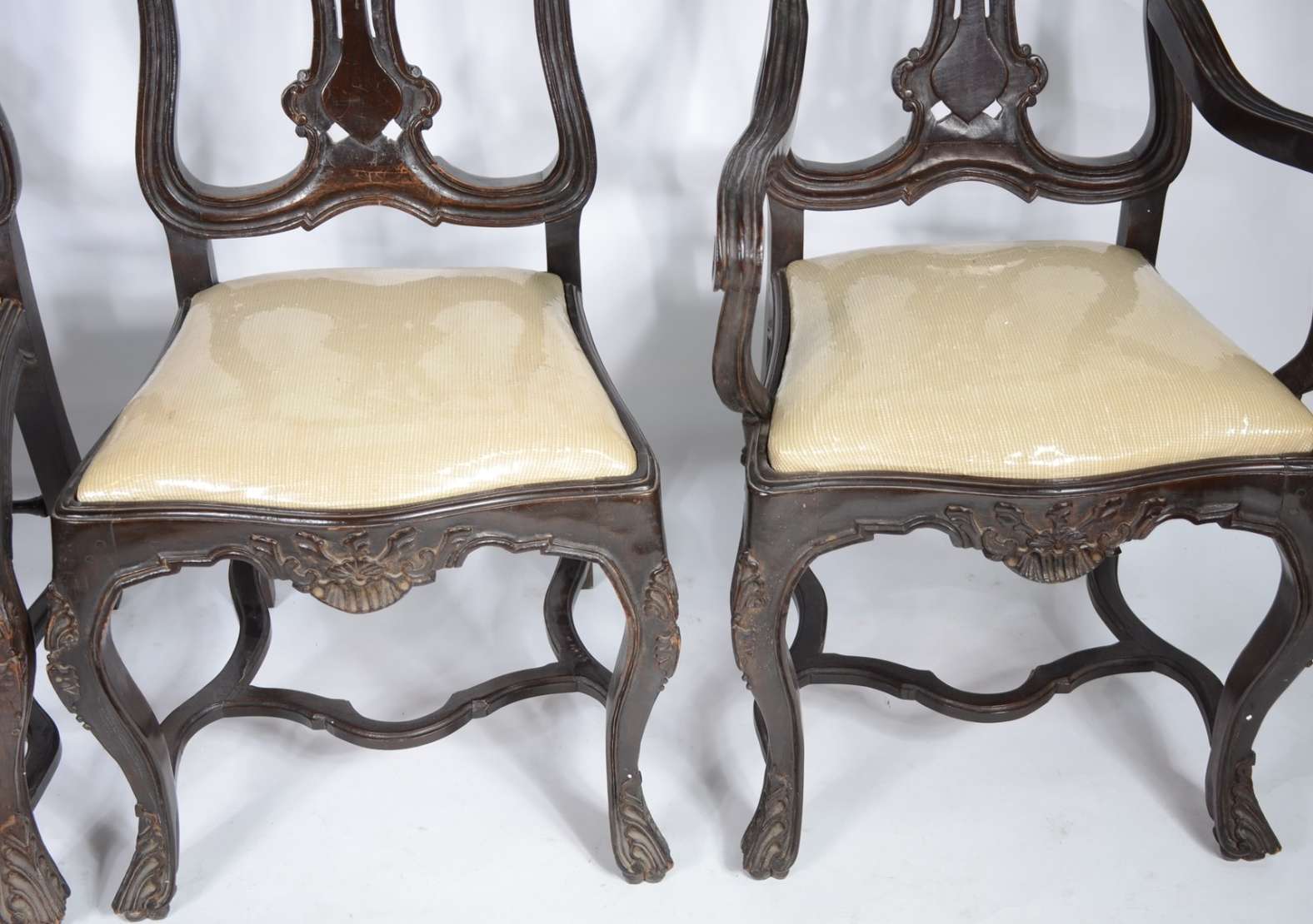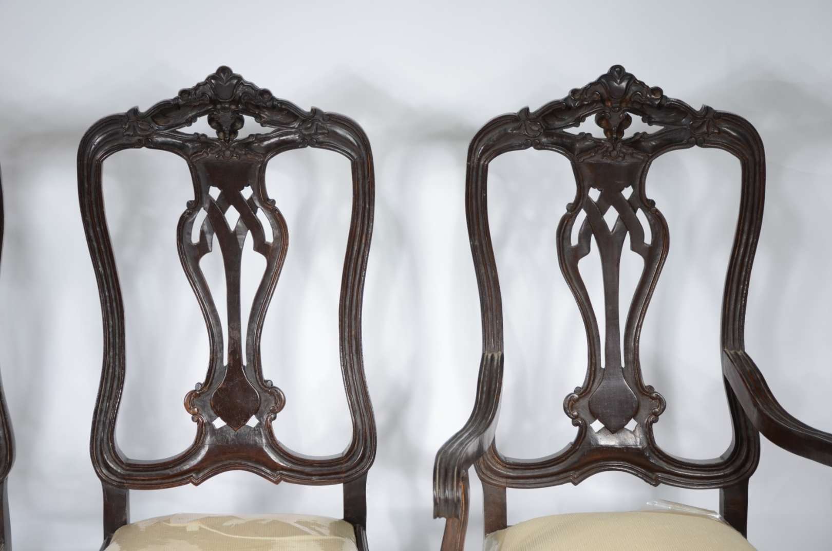 Par de cadeiras de madeira nobre, estofadas e forradas com tecido na cor bege. Estilo inglês vitoriano.