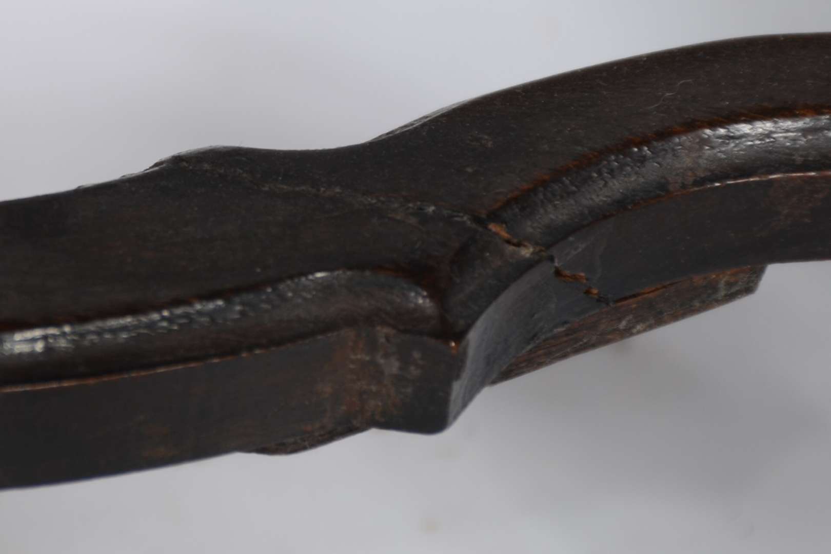 Mesa/ aparador de madeira nobre, saia recortada, quatro pernas torneadas. Manchas no tampo e restauro.