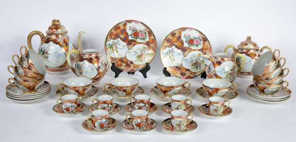 Aparelho de chá e café de porcelana oriental, decorado com figuras de gueixas e flores em policromia e realces dourad...