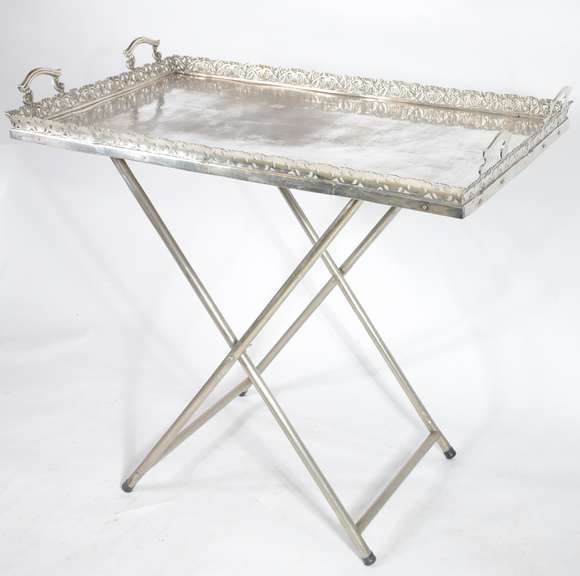 Grande tabuleiro com quatro alças de metal prateado, base feitio cavalete também de metal. Desgastes.