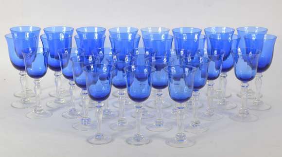 Serviço de vidro azul, composto de: 16 taças para vinho branco e 14 para vinho tinto. Total: 30 peças.