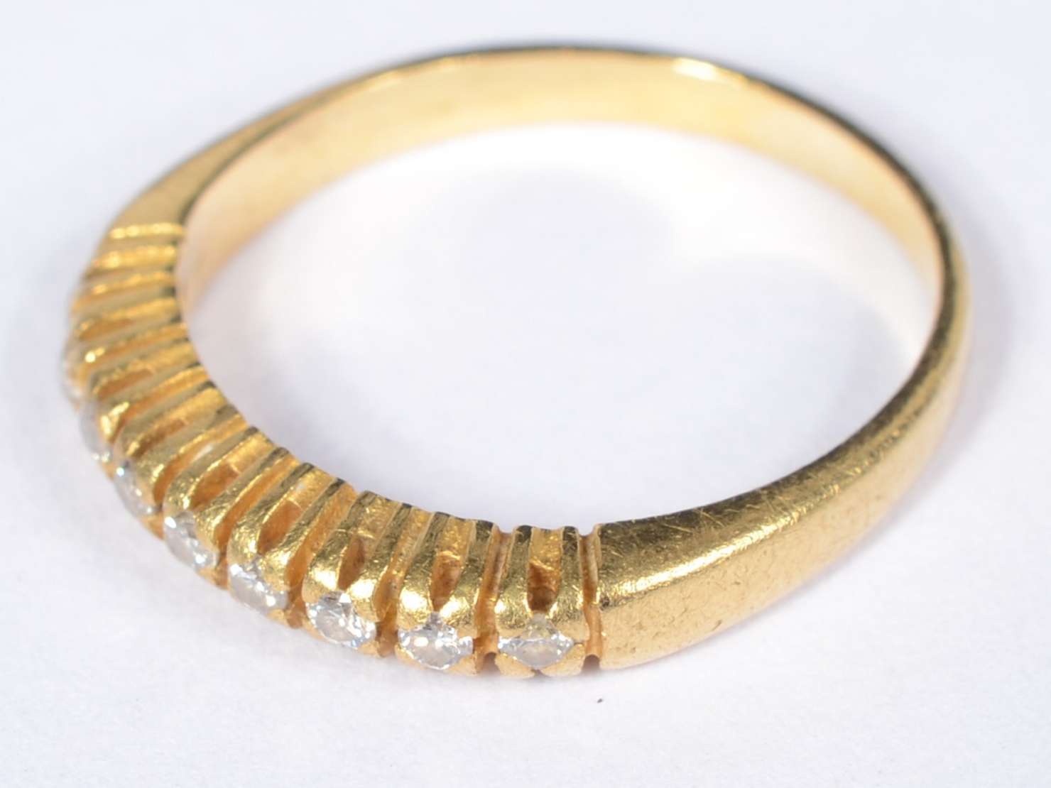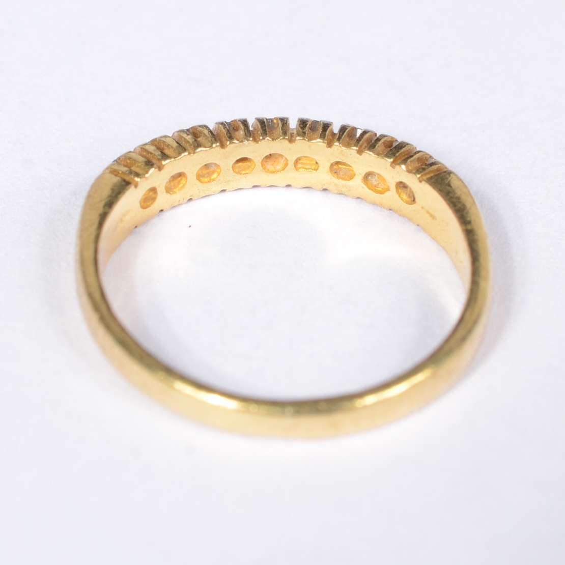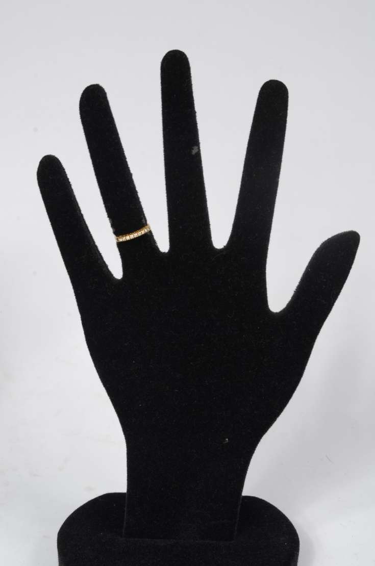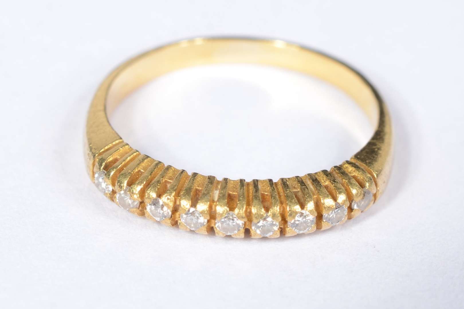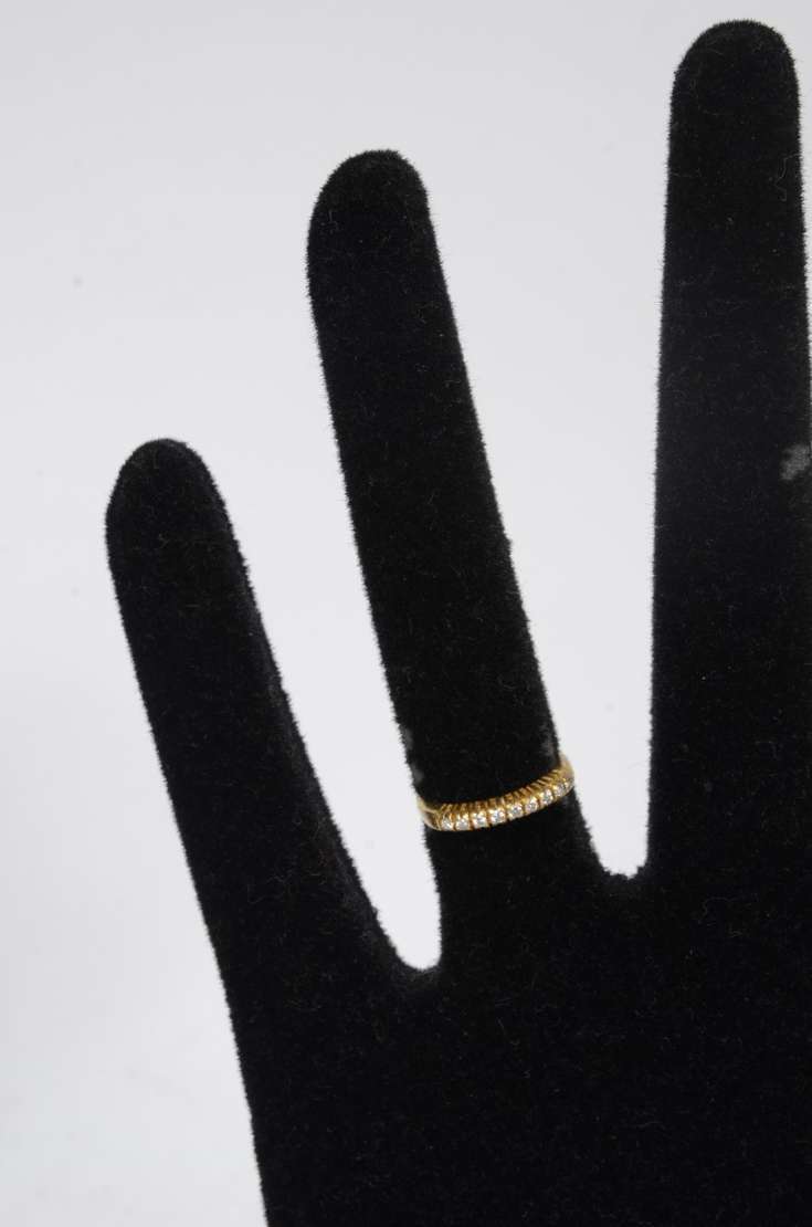 Meia aliança de ouro 18 k., cravejada com aproximadamente 12 brilhantes. Aro 17. (Por motivos de segurança a peça não...