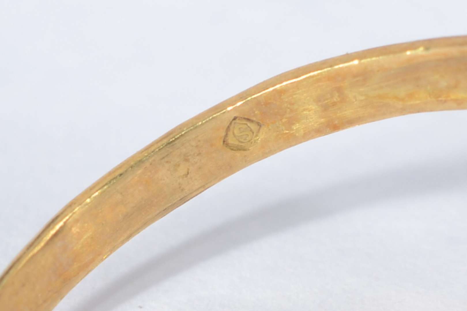 Meia aliança de ouro 18 k., cravejada com aproximadamente 12 brilhantes. Aro 17. (Por motivos de segurança a peça não...
