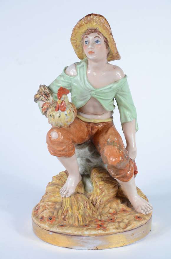 Escultura de porcelana espanhola Sureda em policromia representando campones segurando galo. Apresenta restauro no jo...