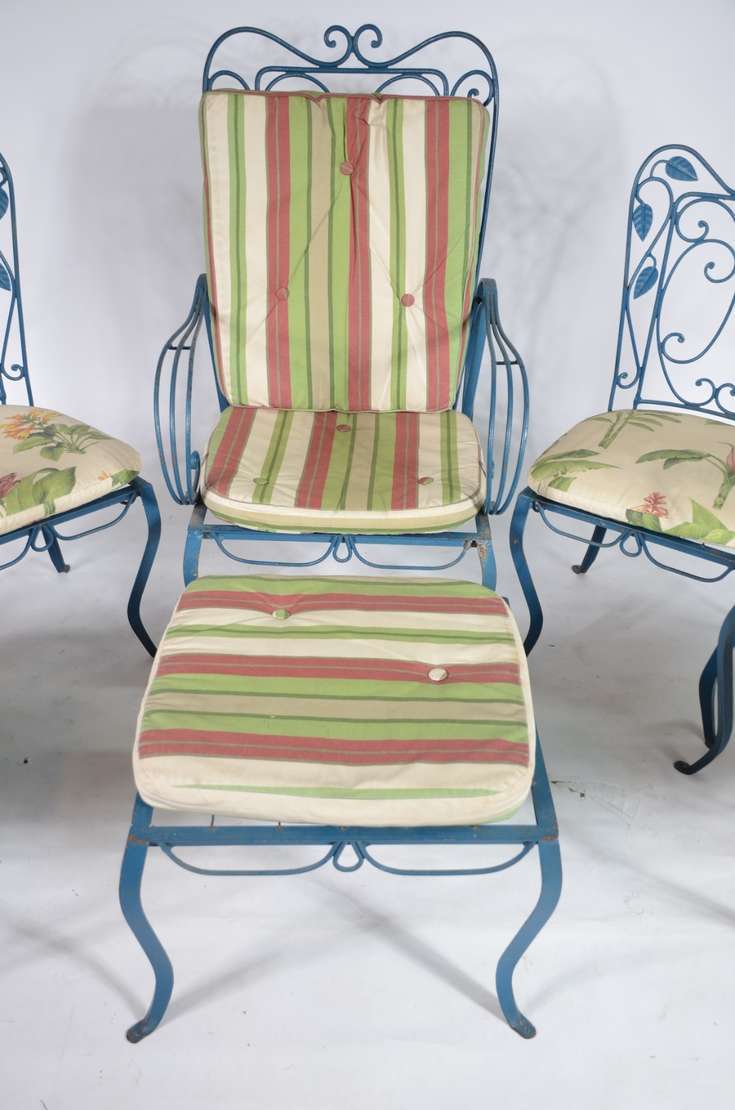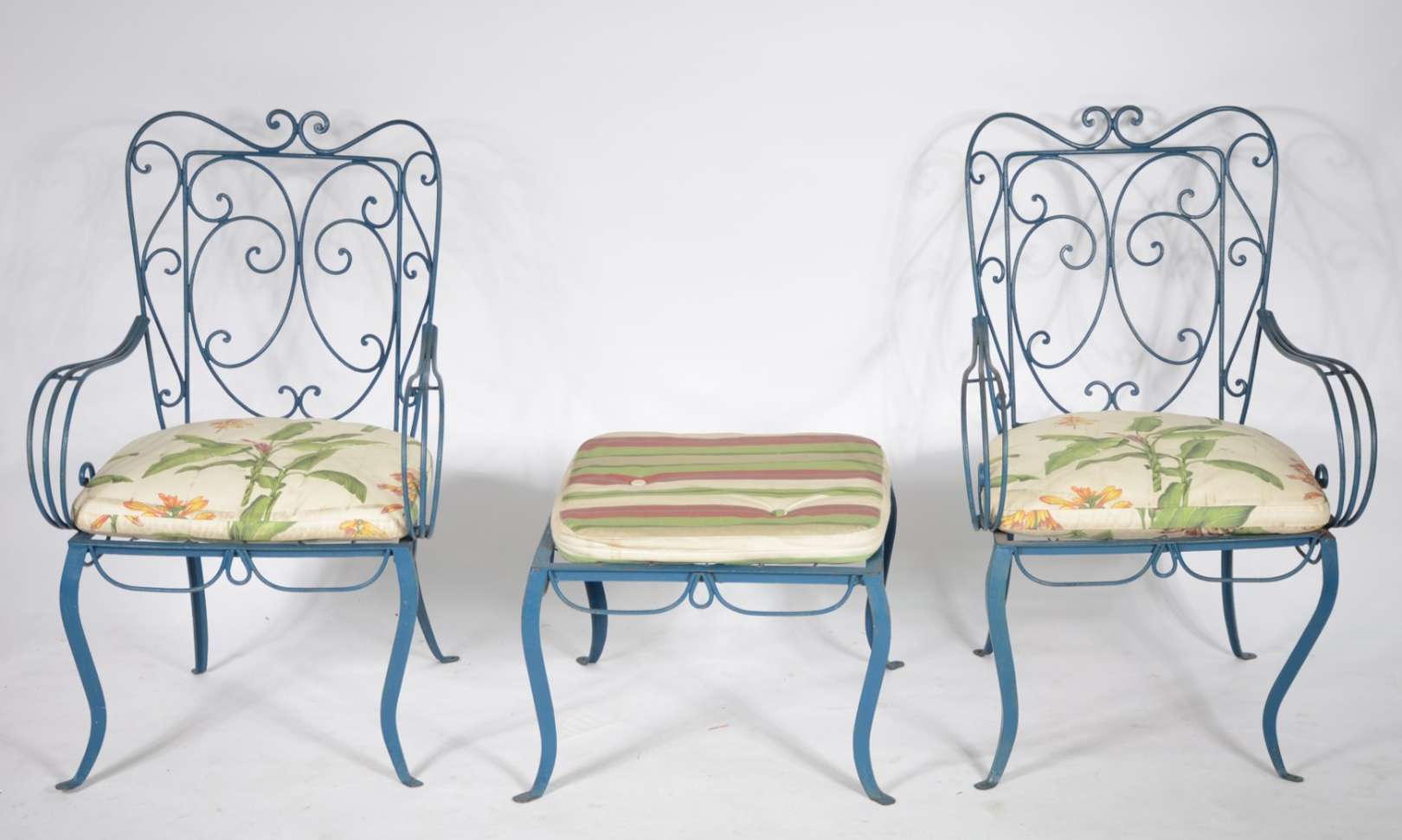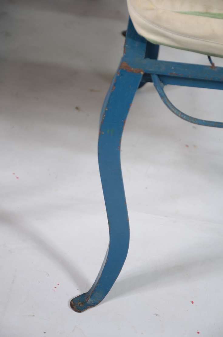 Cadeira de balanço e banqueta de madeira nobre, estofados e forrados em tecido branco com capitoné. Faltando dois "bo...